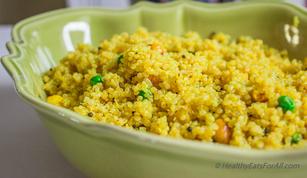 Quinoa is one of those versatile ingredients that can be substituted for a multitude of things. It can be used as a substitute for rice, for flattened rice, pasta etc. In this case I have substituted Quinoa for the flattened rice flakes which were not providing much nutrition wise. So now when we have Quinoa Pohe for breakfast, it gives us a nice balance of complete proteins & fiber without compromising the taste and flavor of the original recipe. The fiber will go up in case you add more vegetables to it. This recipe is a version that I usually make at my home. It works out great for picnics or potlucks, school/office lunches.
