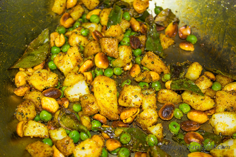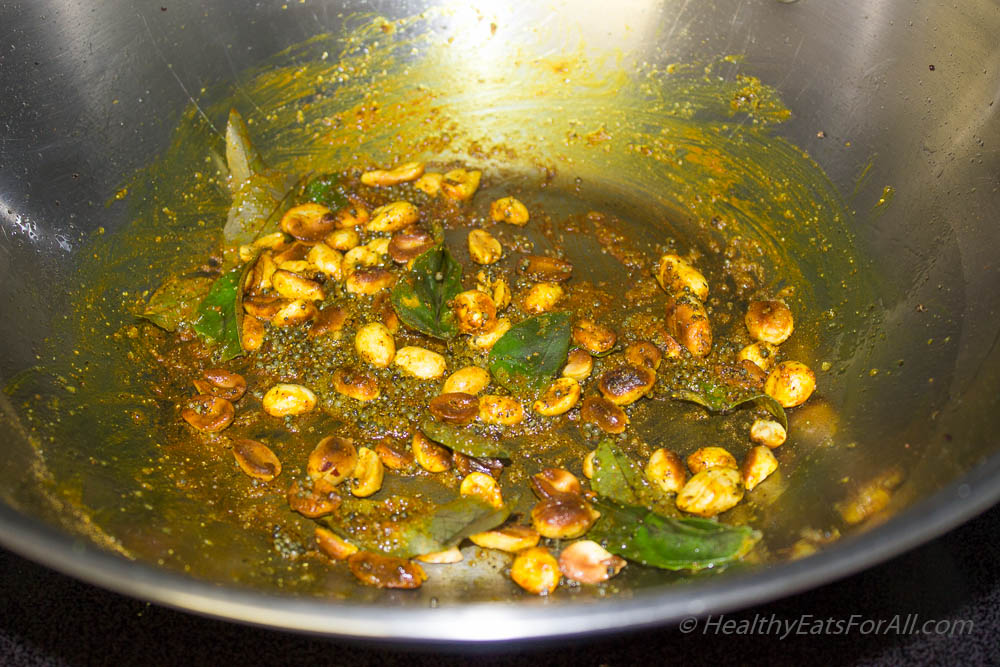 - Heat a wok. Add the oil & warm for a little bit. Then add the mustard seeds. When they begin to sputter, add the peanuts and roast for a bit.