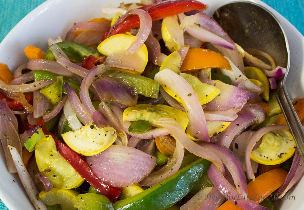 • Heat the pan and add about 1 ½ T olive oil. Add the vegetables, 1 t salt, and 1 t oregano. Sauté them for about 7-8 minutes. They should still be a bit crisp. Put them in a bowl.