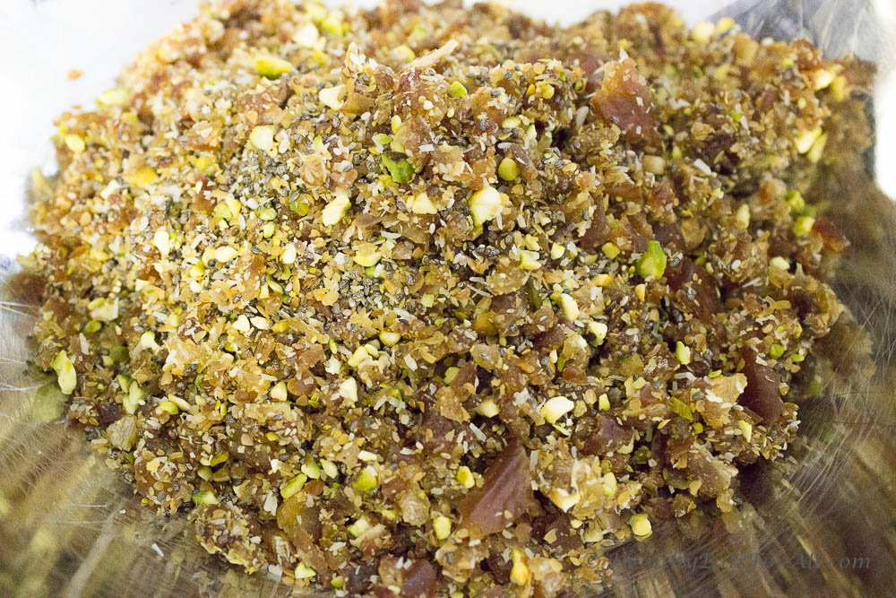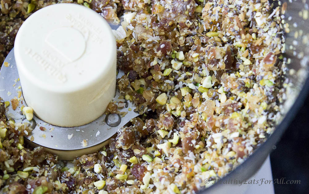 - Add the pistachios; coconut and flax to the food processor first, give a few pulses.