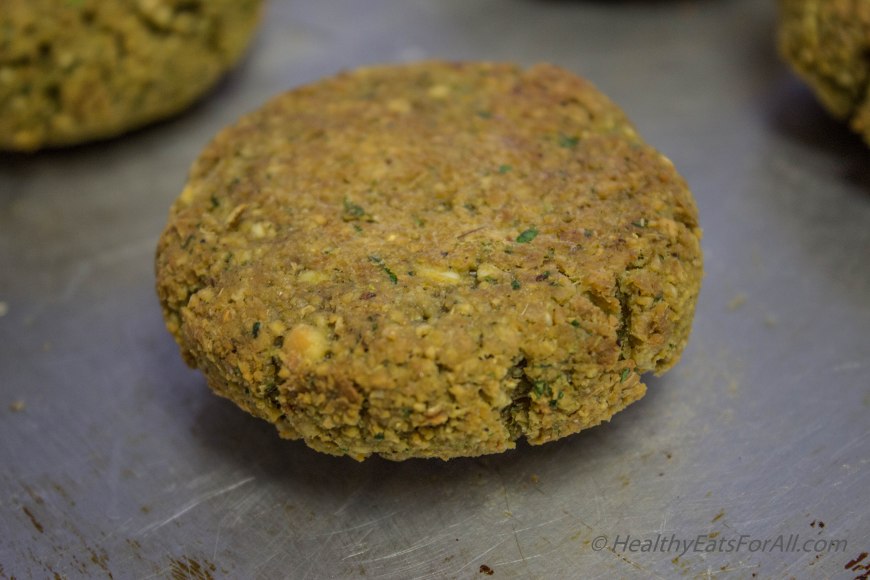 · Grease a baking tray. Make approximately 2” balls with the mixture (it will be slightly moist) and slightly flatten into a patty and put on the greased tray. I make them into patties rather than the traditional balls because it takes less time to cook them from the inside when they are flat. If you bake them as round balls, they tend to become a bit dry. I figured they have to be smooshed once in the pita, might as well flatten them while baking 🙂