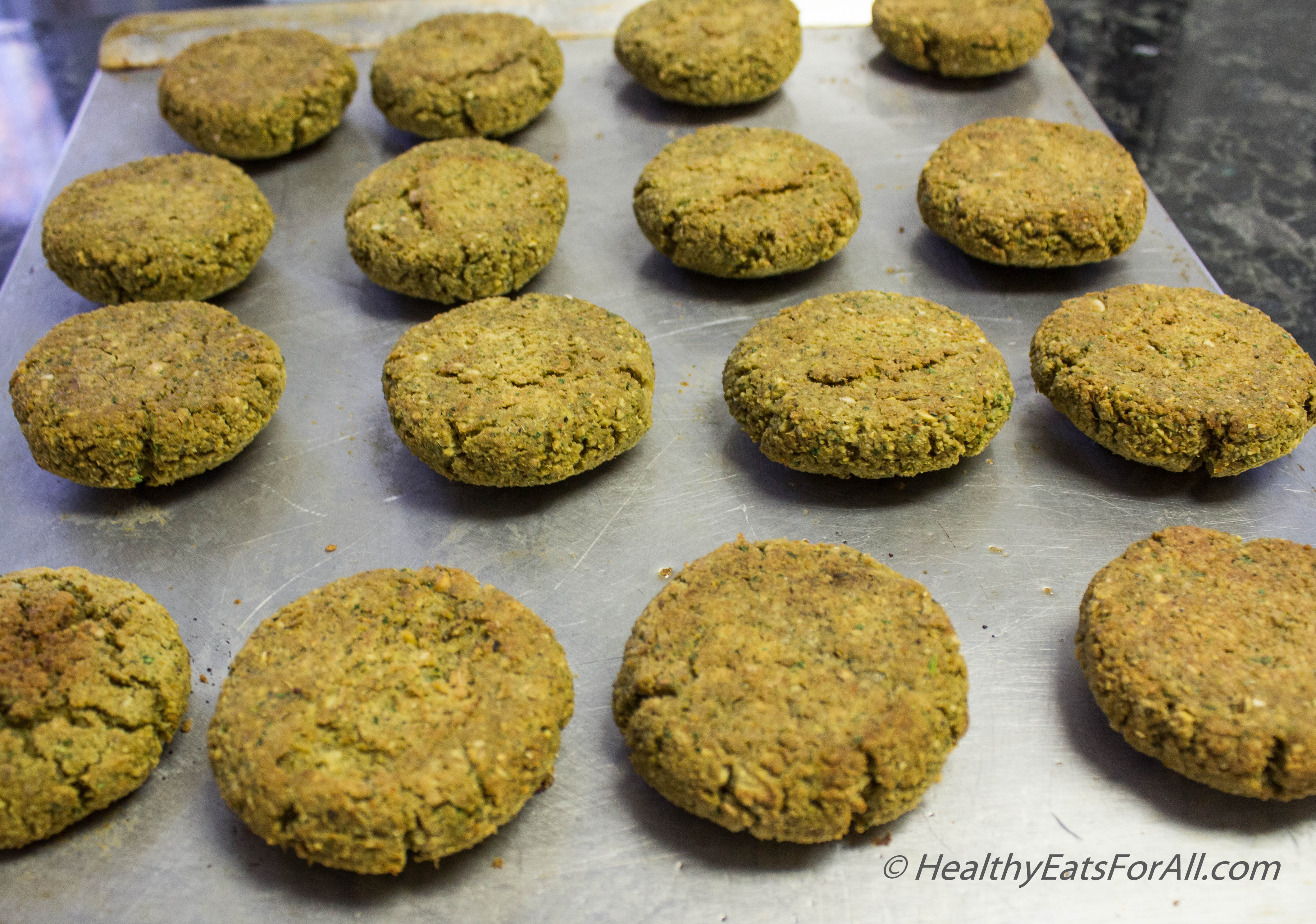 · Grease a baking tray. Make approximately 2” balls with the mixture (it will be slightly moist) and slightly flatten into a patty and put on the greased tray. I make them into patties rather than the traditional balls because it takes less time to cook them from the inside when they are flat. If you bake them as round balls, they tend to become a bit dry. I figured they have to be smooshed once in the pita, might as well flatten them while baking 🙂