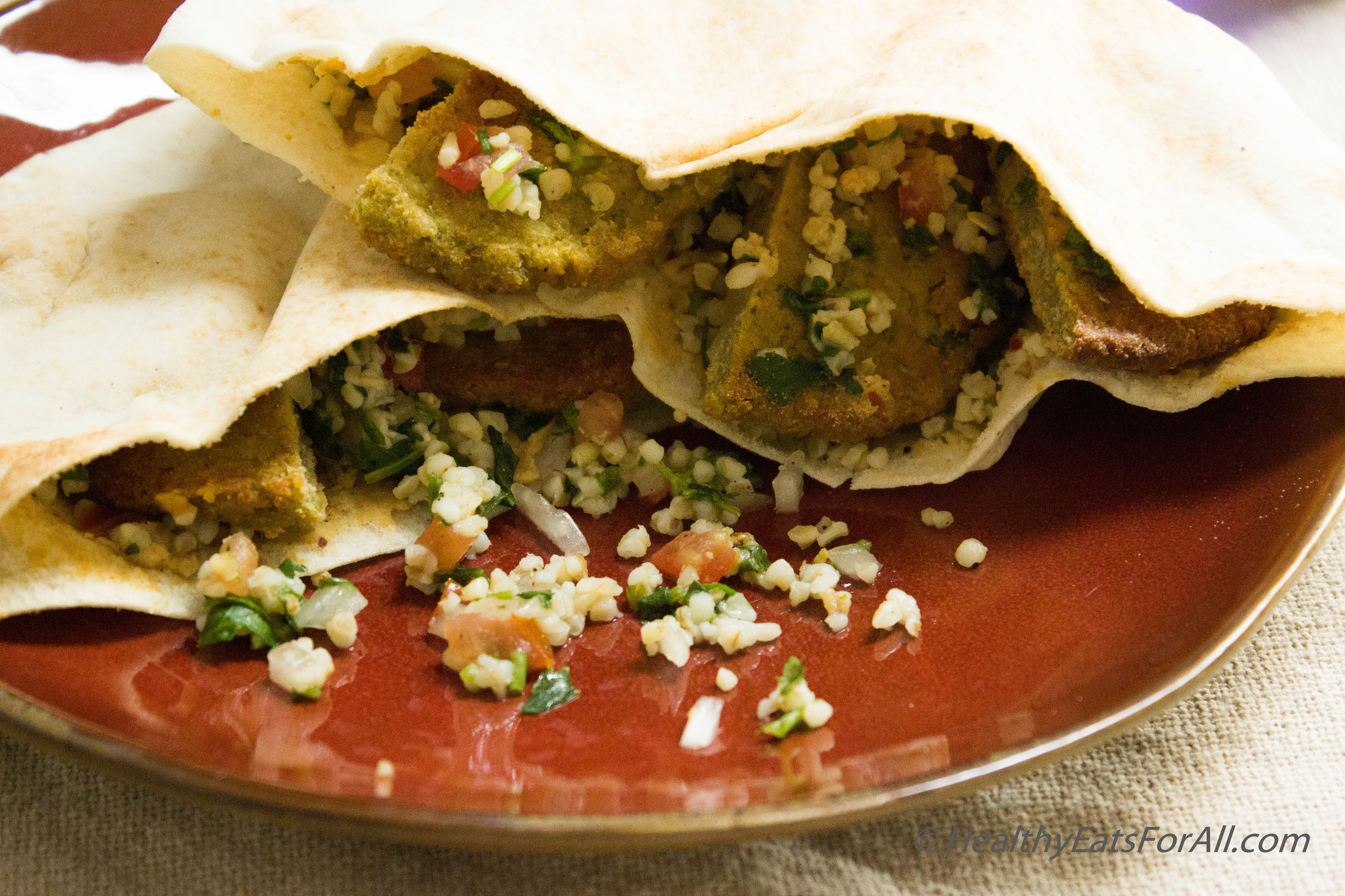 · To serve them, cut the pita bread into half and slightly warm it. Open the pockets, put a layer of Hummus(check out my recipe) in it. Add about 1-1 ½ falafel, puts lots of Tabbouleh Salad in there or if you don’t have that plenty of chopped lettuce and tomatoes and some hot sauce at the end. Some people prefer adding tahini sauce or Tzatziki sauce. It’s totally up to you.