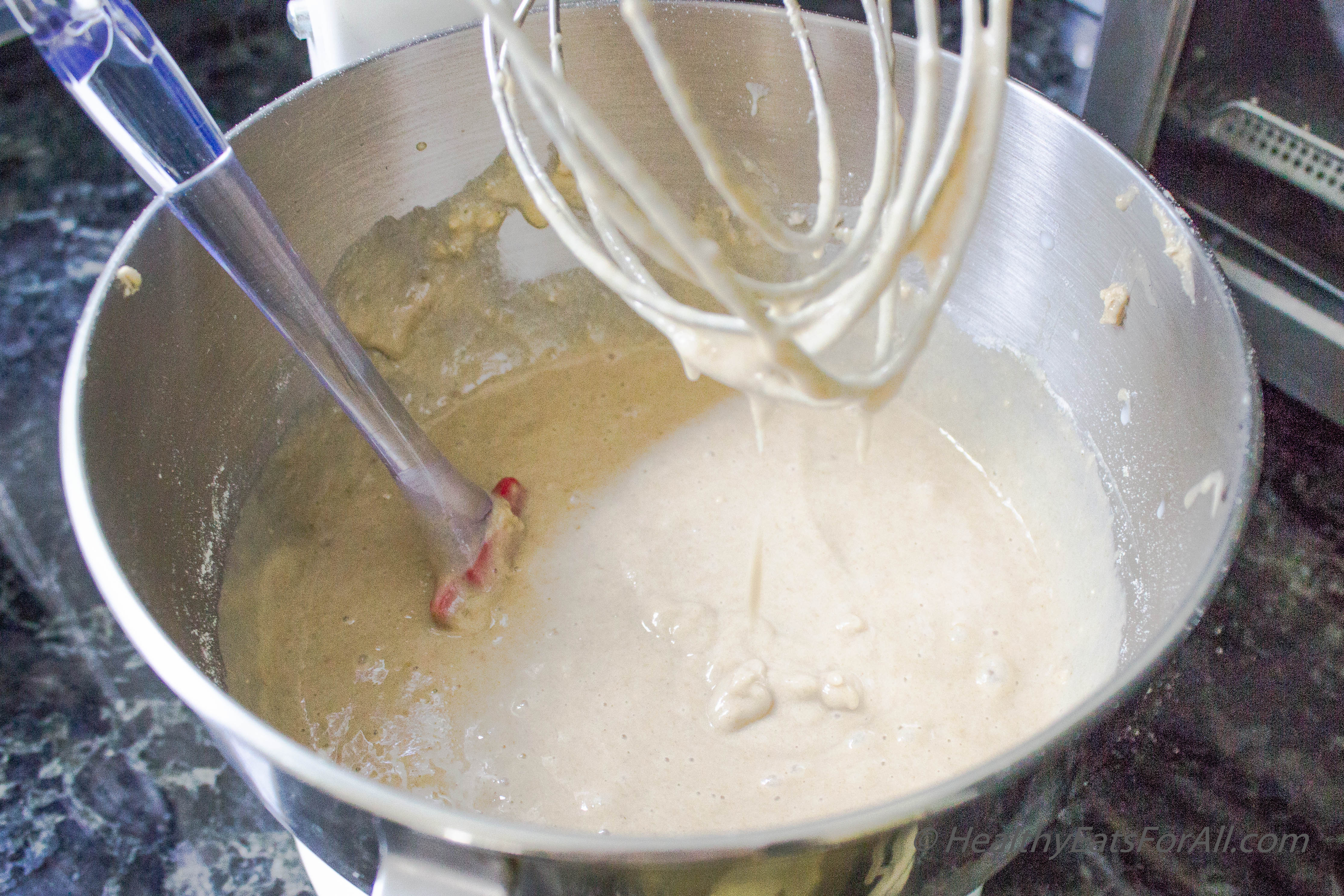 - Add the sugar and oil and vanilla to food mixer and blend well.