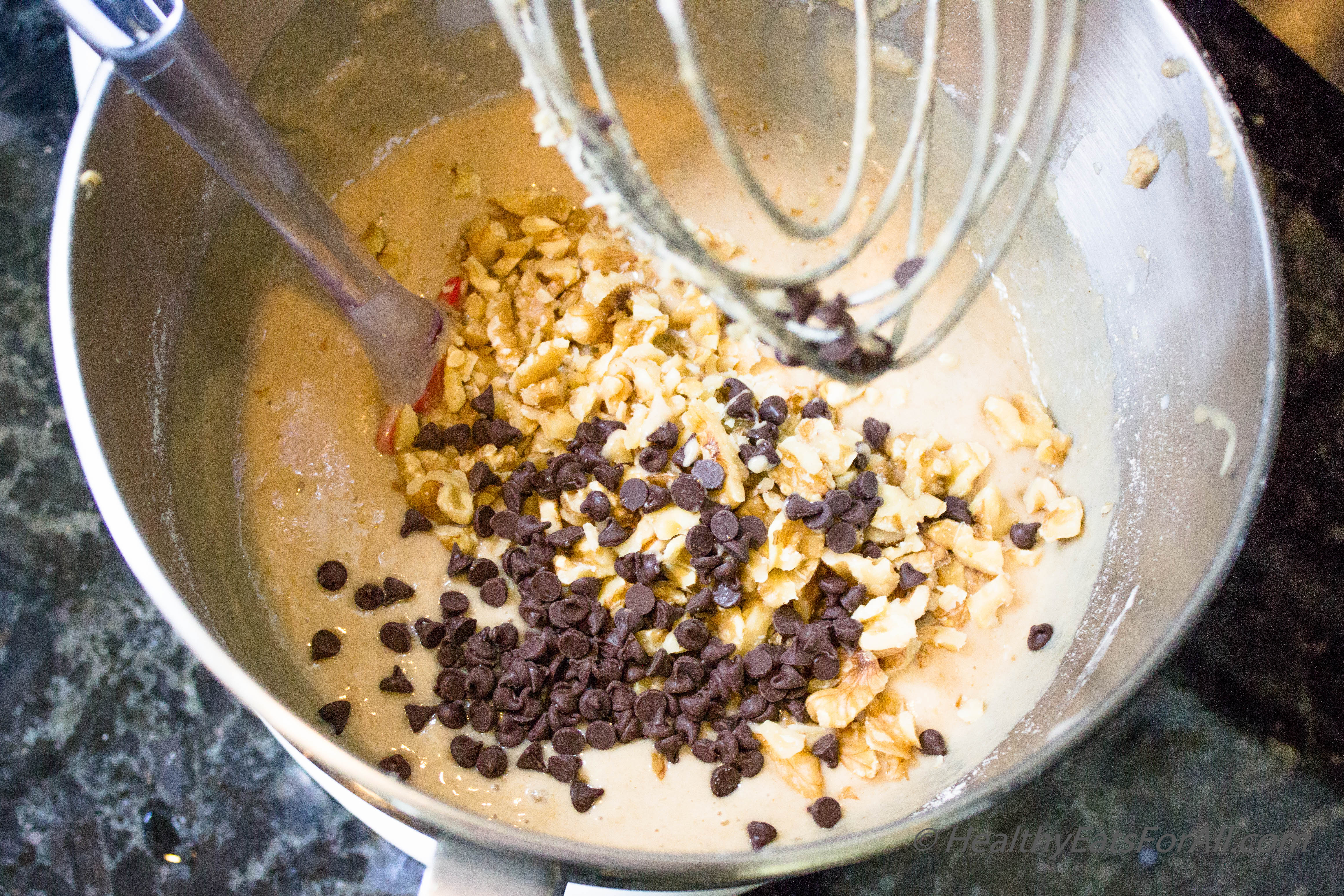 - Then add the dry ingredients. Add optional ingredients walnuts and chocolate chips after rolling in dry flour at the end so that they don’t sink at the bottom.