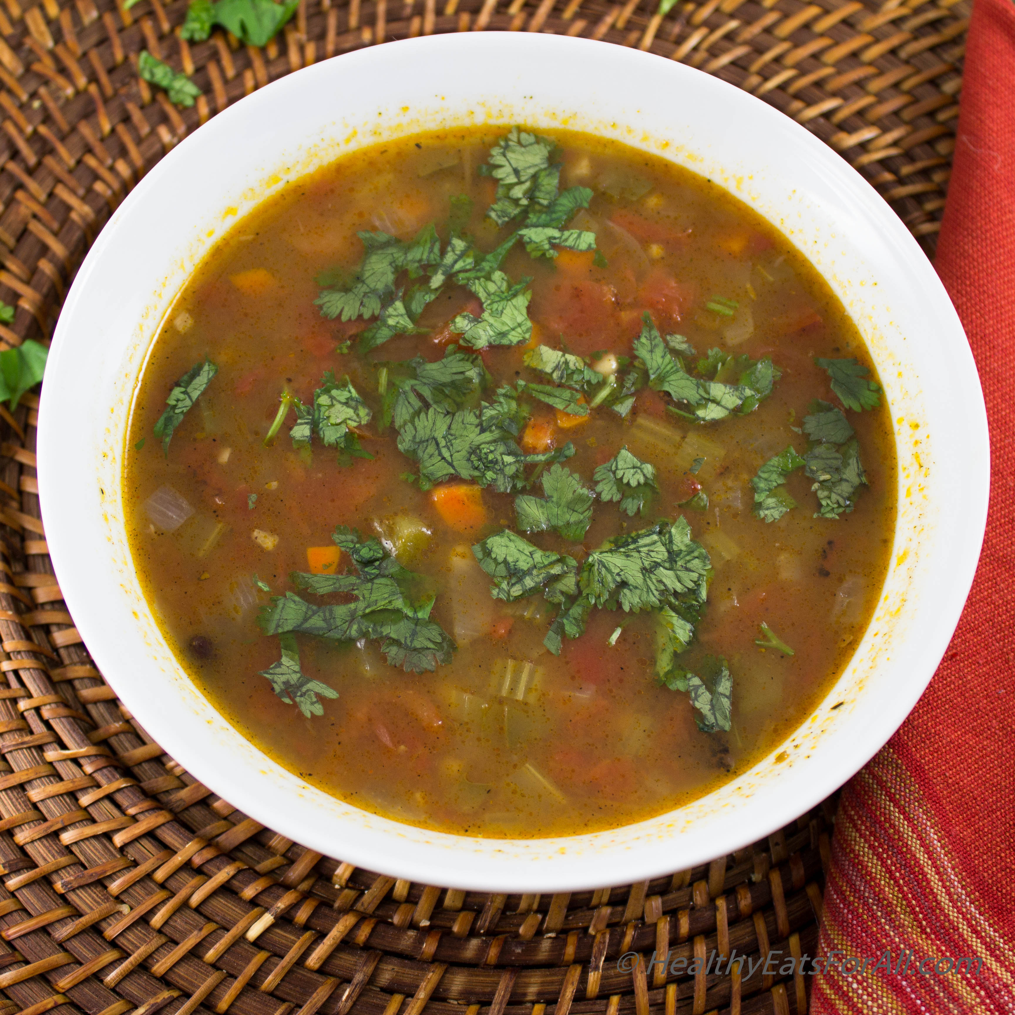 As soon as the weather changes and fall is here, it’s like the gears inside us also switch. It starts getting dark sooner, there is a distinct chill in the air, and most important of all……Halloween costumes start appearing in the stores:) Personally, around this time I really start to crave a warm bowl of soup! One of my favorites is a veggie soup that I used to have at Panera. But of course, having it there a few times made me want to try to replicate it at home! So here is my version of the Panera veggie soup with black beans and fire roasted tomatoes. My version I feel has a lot more vegetables and of course lots of beans which increases the protein and fiber! Also my soup I feel is lot more flavorful due to the buffalo sauce, cilantro and ground cumin that I add 🙂 Usually I like to make a meal out of it by adding some Crispy Baked Cajun Potato Fries and some grilled veggies, along with some nice warm rolls or a crusty bread slice.