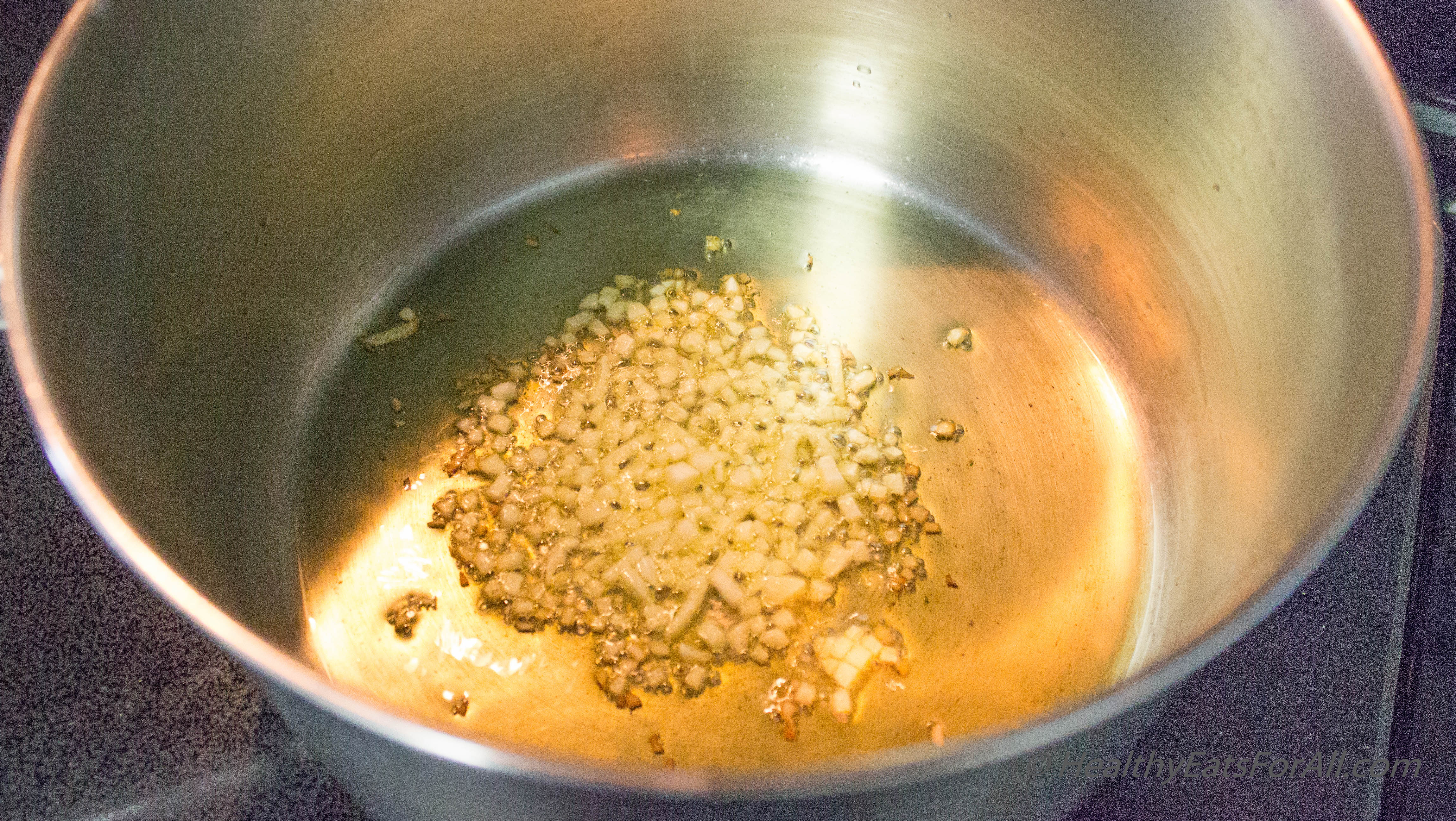 · Warm a large pot. Add 1T extra virgin olive oil. Add the garlic and sauté for a few seconds.
