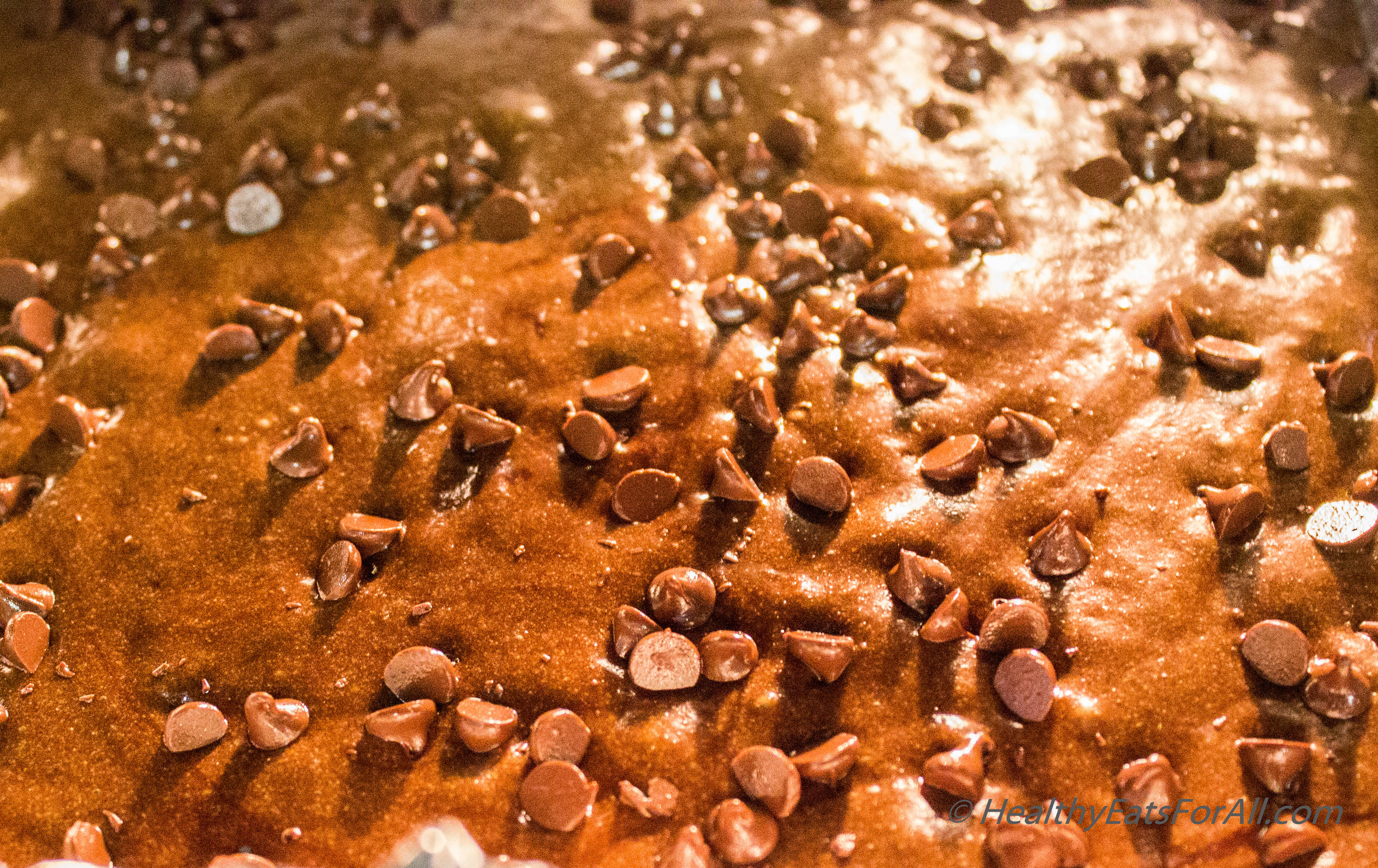 · Pour the mix into the greased aluminum foil lined pan. Sprinkle the rest ½ T mini chocolate chips on top.