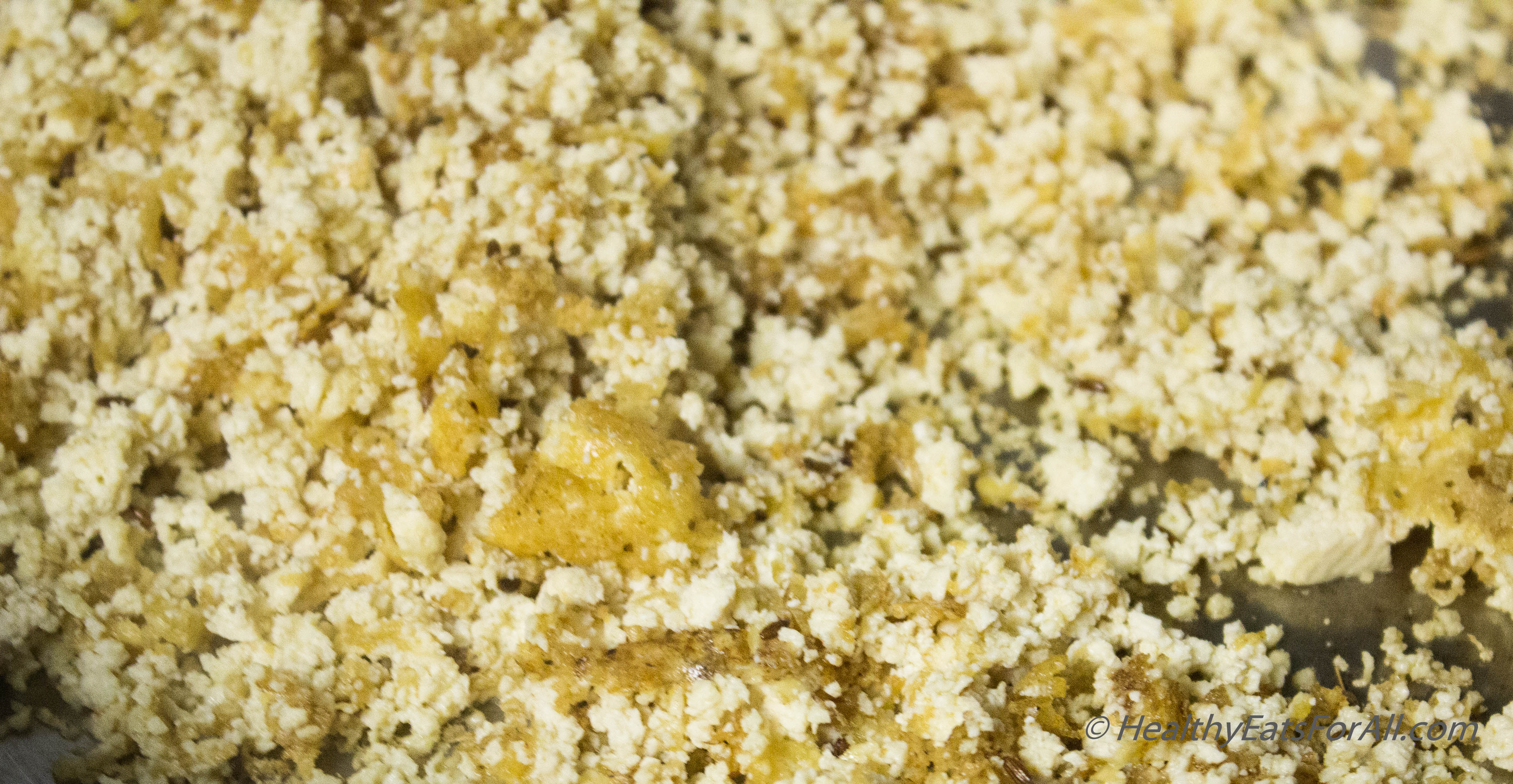 - In the same pan add remaining oil. Once it is heated, add the crumbled tofu and sauté for 3-4 minutes till turns slightly brown.