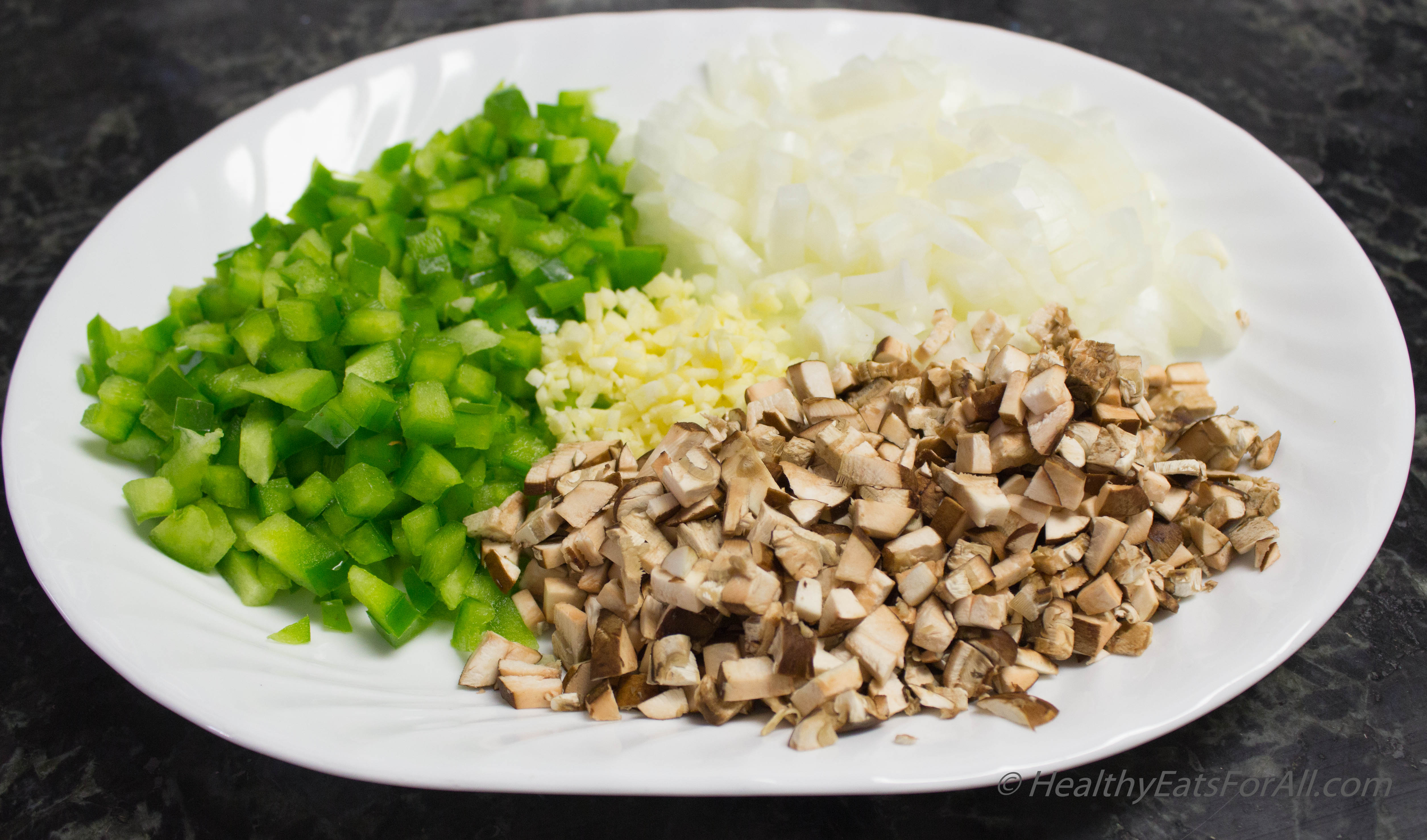 - Once the cumin is crackling, add the onion, garlic, green peppers and mushrooms. Sauté for 3-4 minutes till onions are translucent. Then remove them to a bowl.