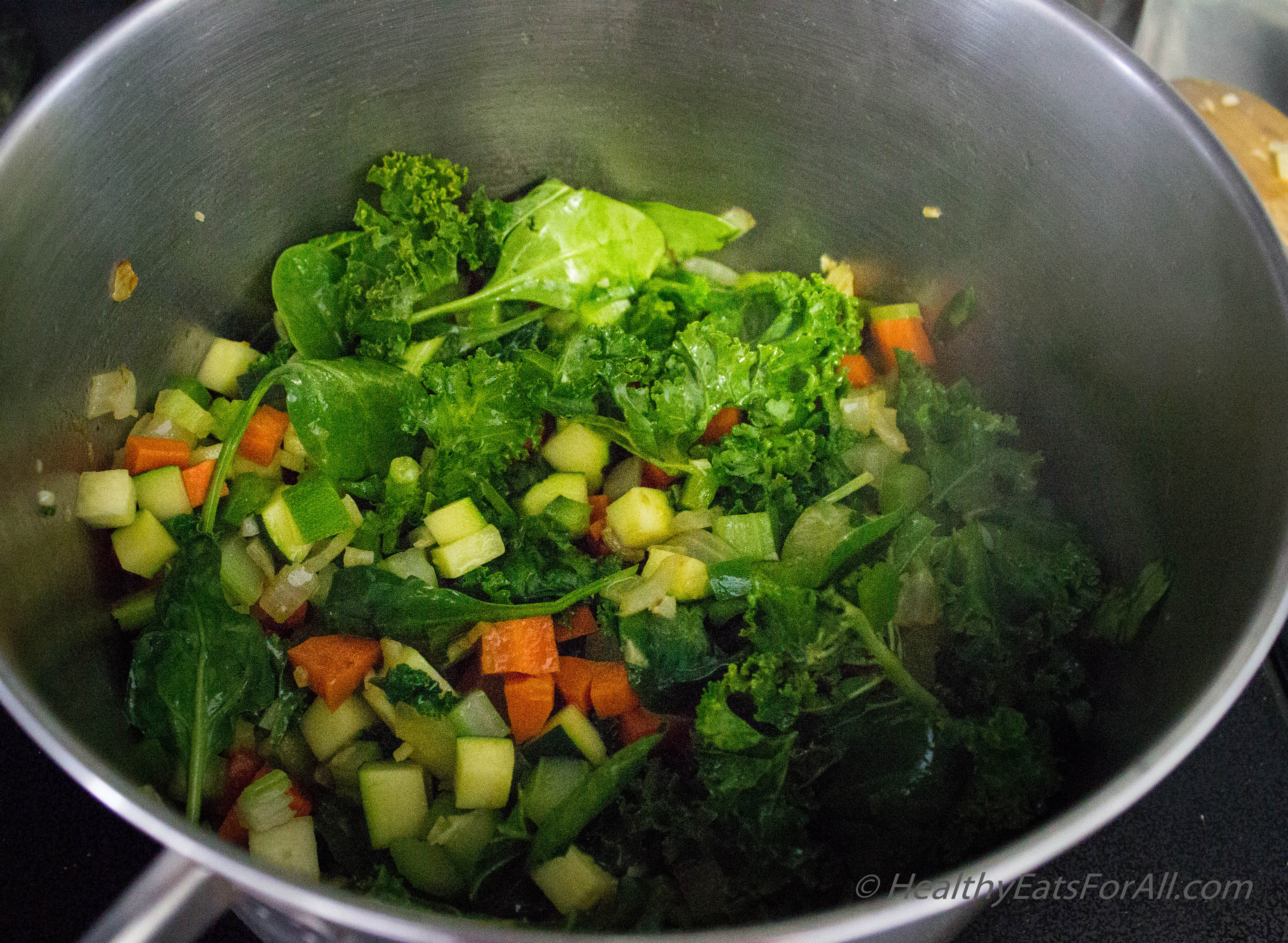 • Stir all the veggies for a bit then add the vegetable broth.