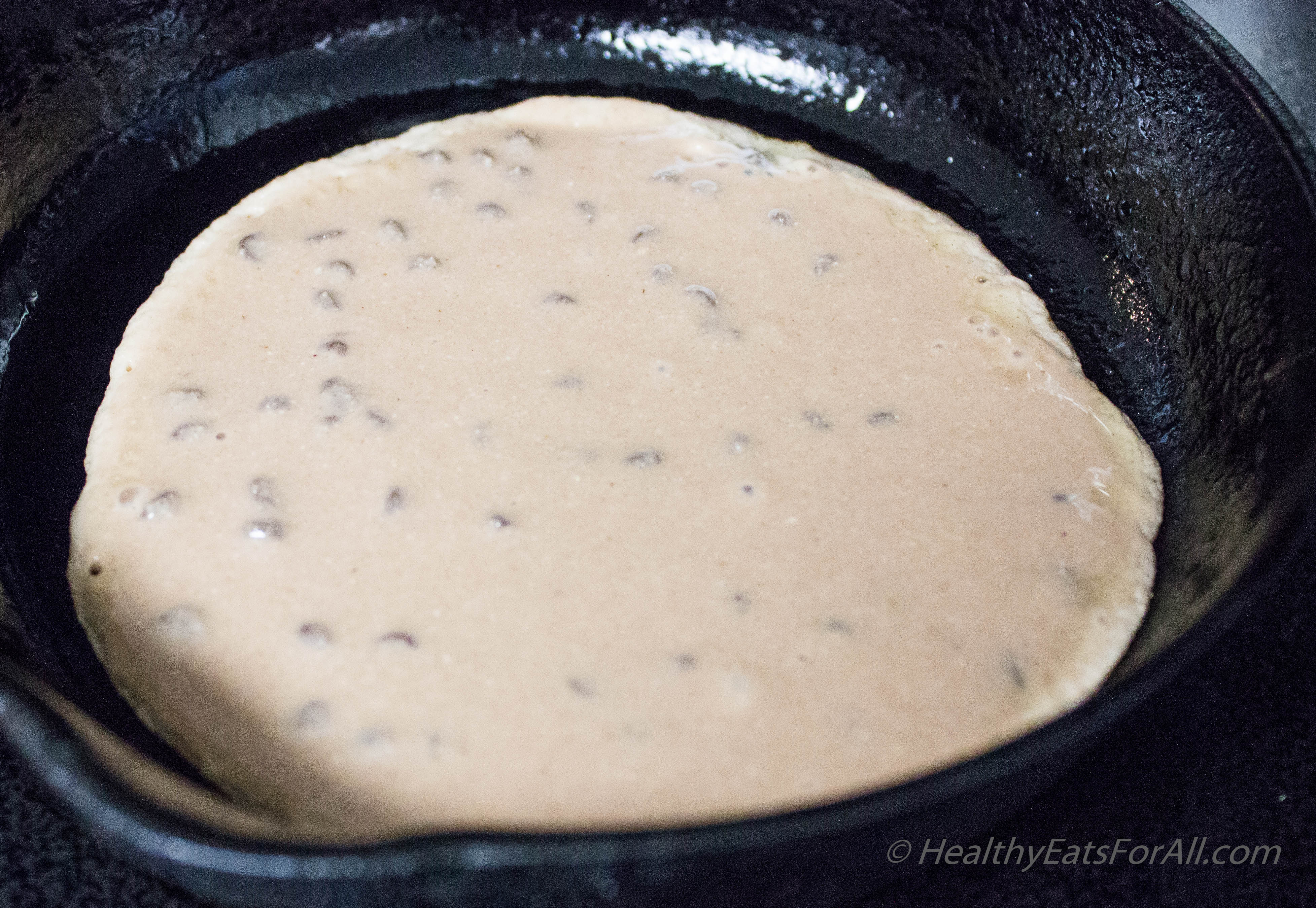 - Drizzle a bit of oil on the pan and pour a ladle full of batter. Keep heat at medium or low.