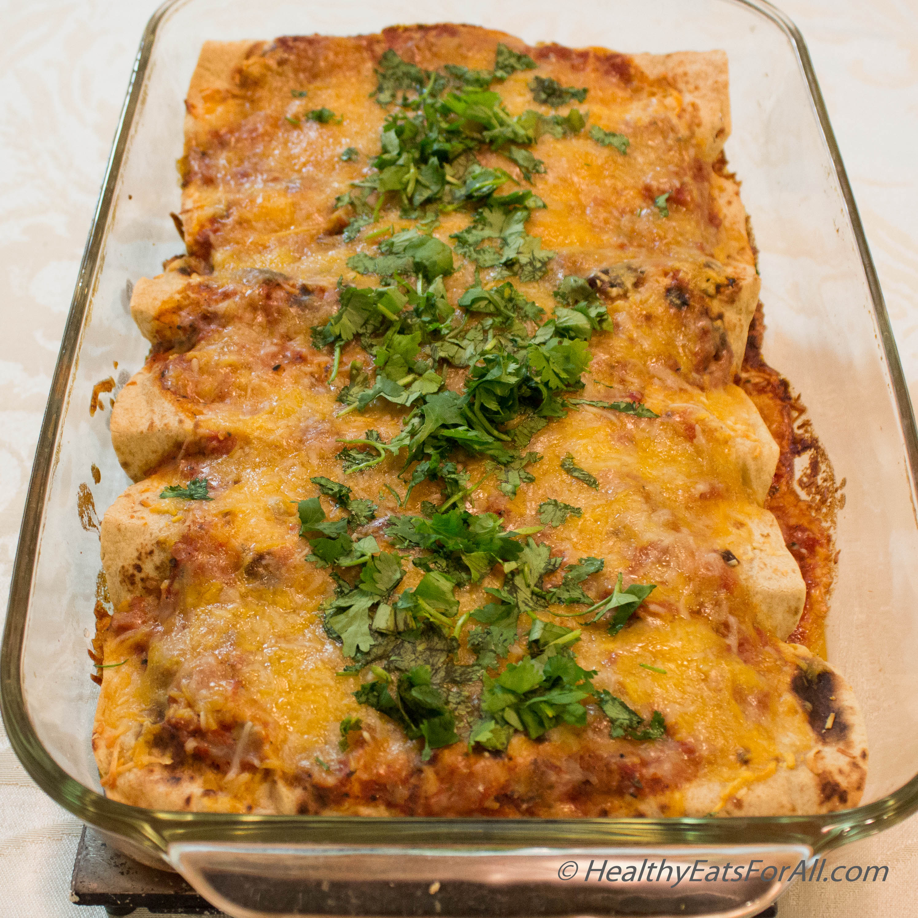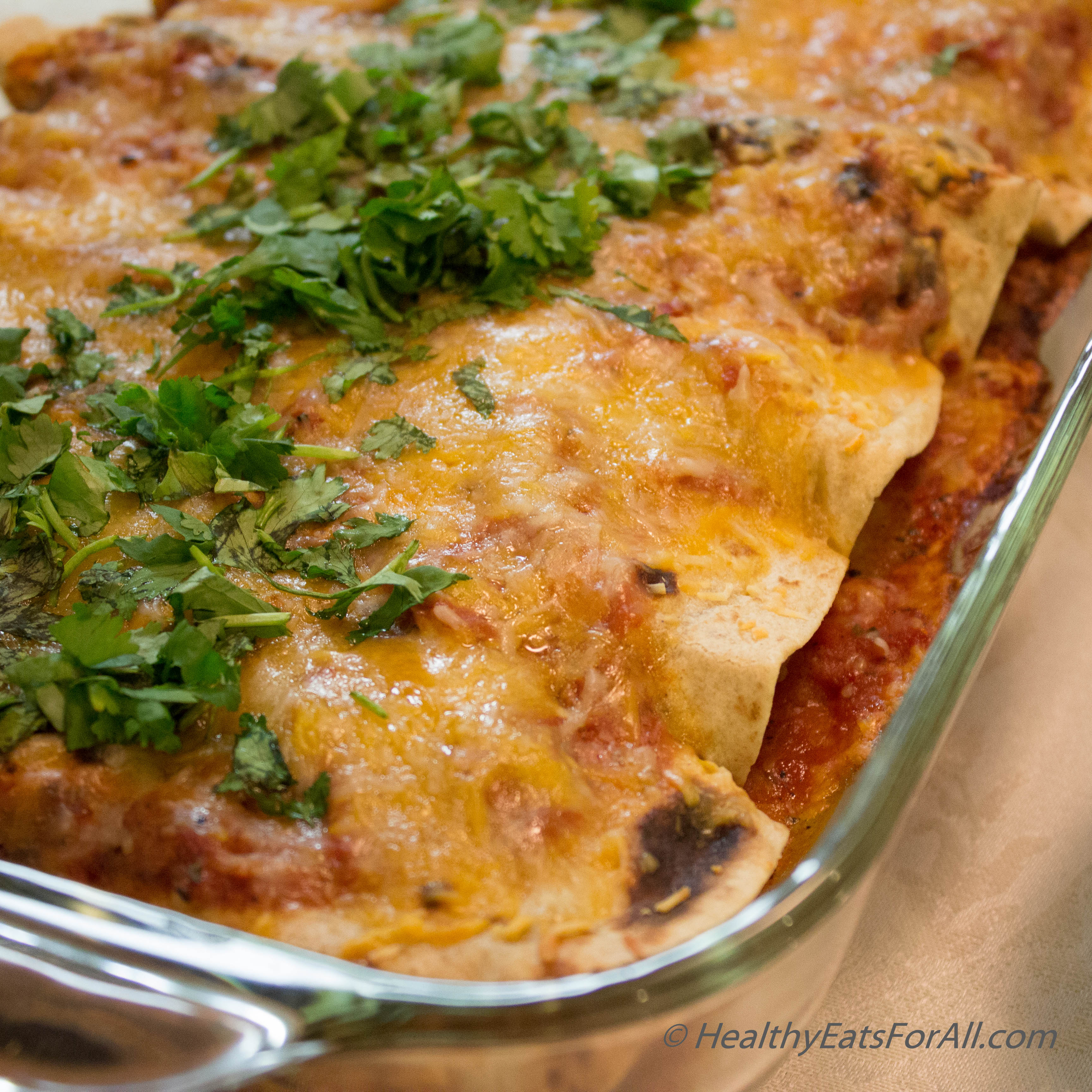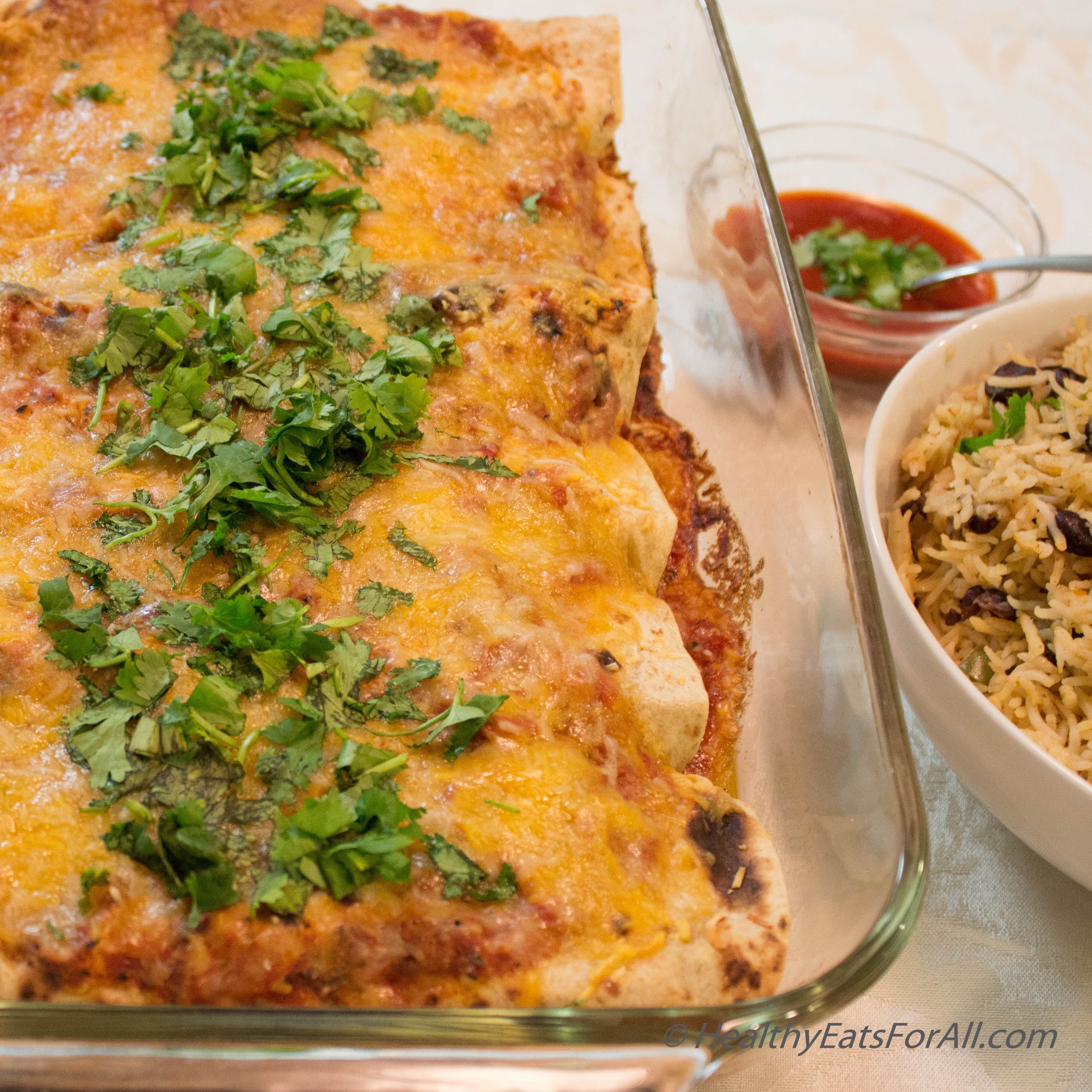 I prefer using boiled red kidney beans (either boiled at home or from a can) over using refried beans. Trust me, there is a huge difference in the taste! By doing this, you also have complete control over the meal: how much fat there is, how much sodium, etc. Once you make the filling, you’ll notice that the mixture is gooey even without adding tons of cheese. You can certainly add some if you want, but I never add it in the mixture and don’t miss it. The only cheese I add is on top of the enchiladas at the end before baking. I usually also add a cup of cooked Mexican rice to the filling to absorb some of the moisture from the salsa so that the burritos don’t become soggy. Whenever I make this bean burrito mixture, I end up making enough for about 12 enchiladas, so I actually make only 6 so that I can save (or freeze) the other half of the mixture for another day!