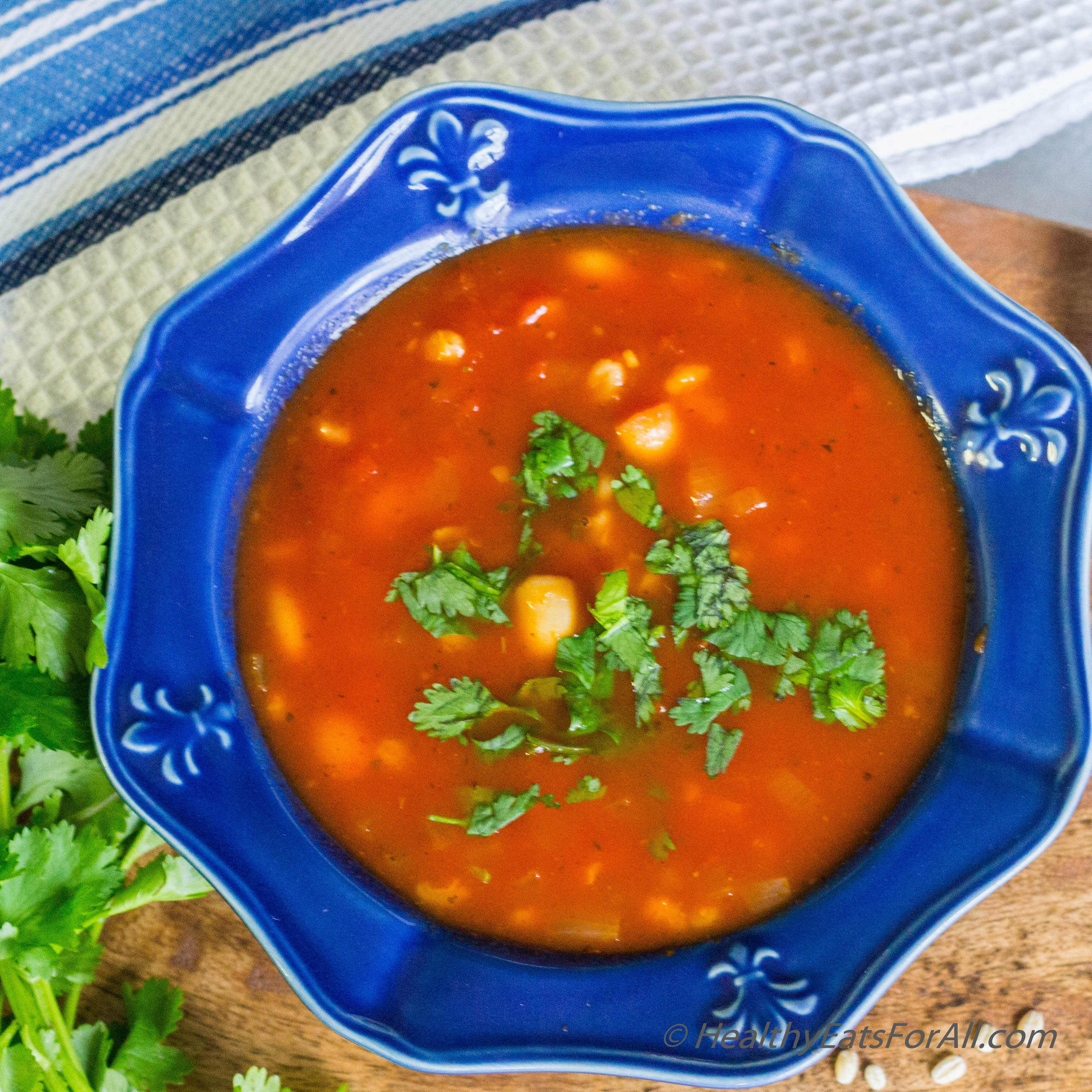 My version of the healthified Pasta Fagioli soup has no pasta! Instead I have added Barley which has complex carbs, and is an excellent vegetarian source of protein, fiber and lots of trace elements. Barley is a great substitute for the Ditalini pasta which is normally used in this soup. It makes the soup heartier, filling and more nutritious. Also, in the traditional Italian version, much more oil is added to this recipe (approximately ½ cup) but I have made it with only 2 tablespoons. Plus, I have also skipped cheese. I hope you will enjoy this soup, and stay warm! I know we will 🙂