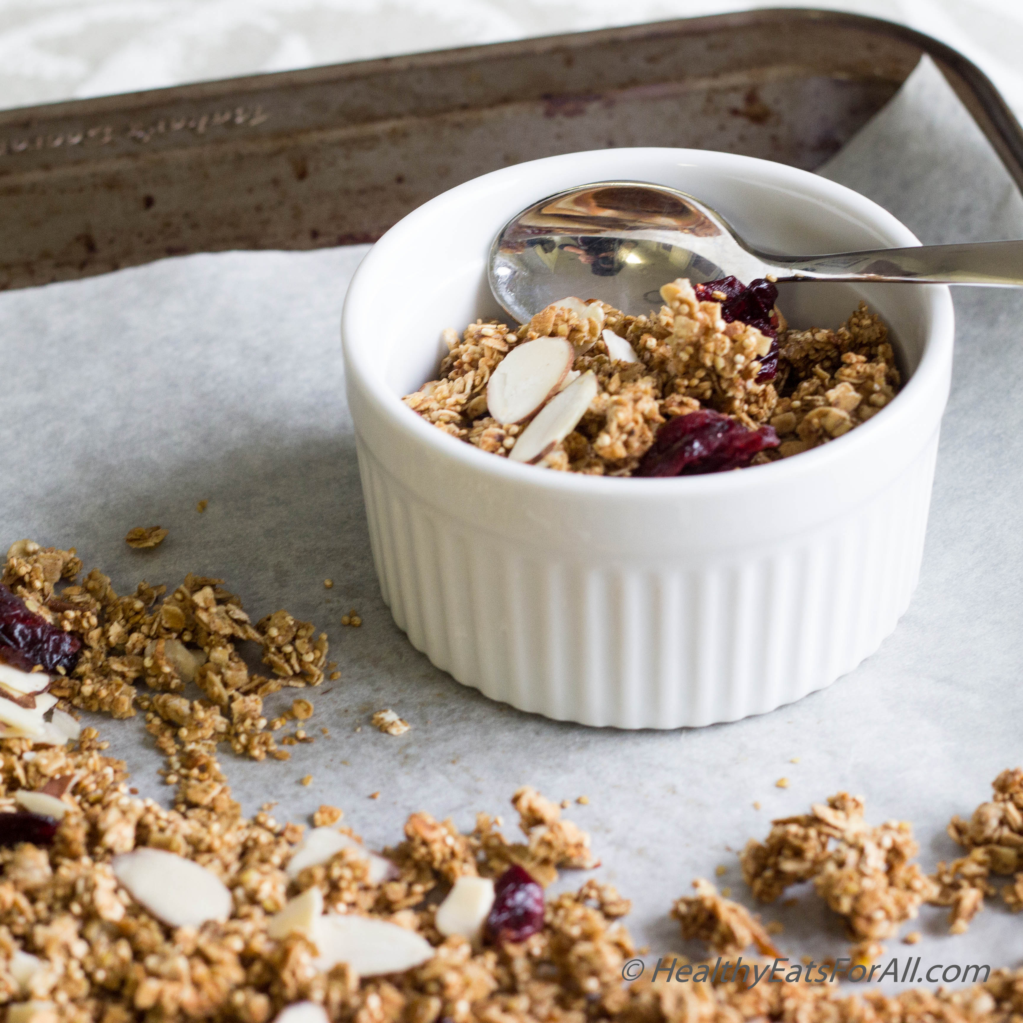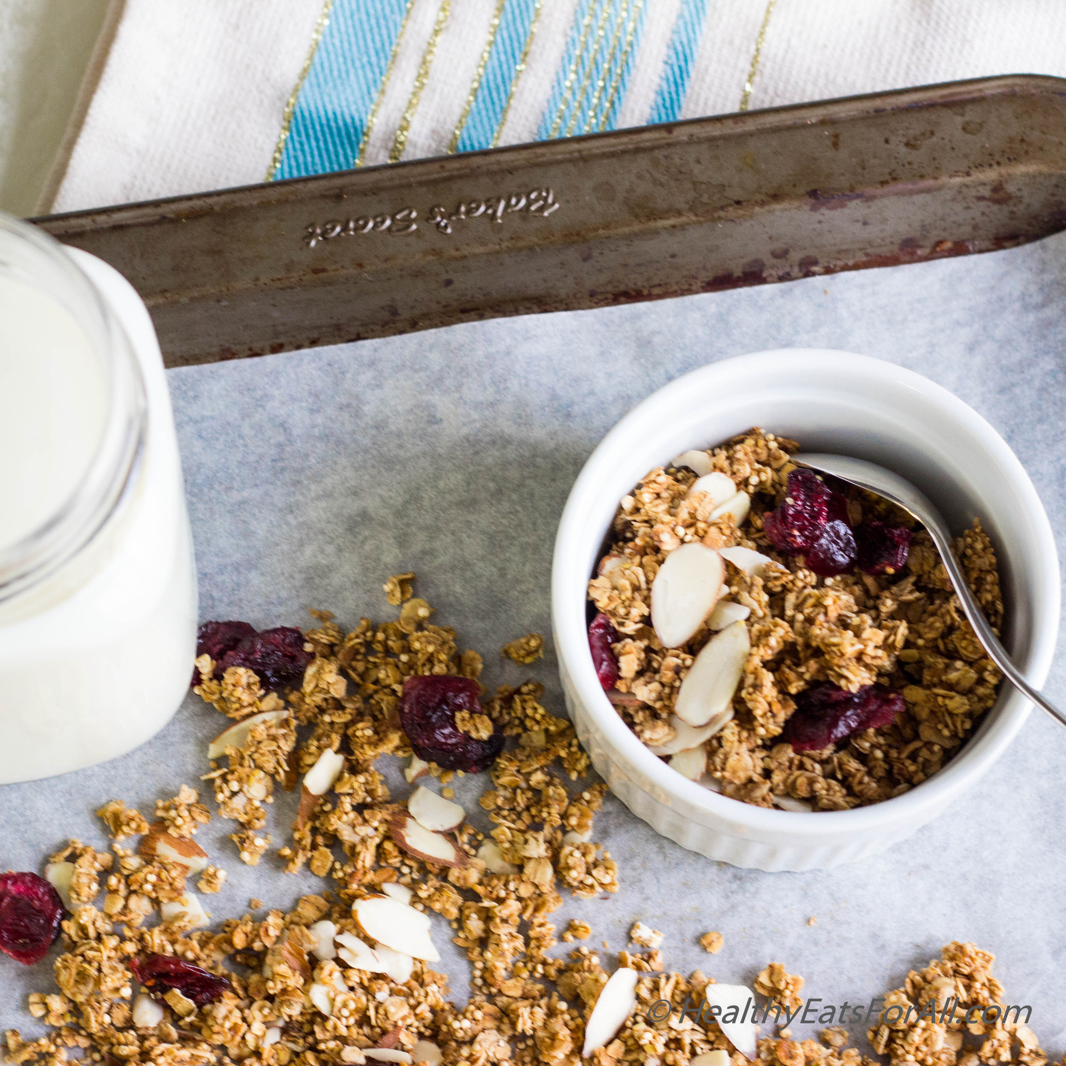 Usually the types of granola that I buy have lots of almonds and either cranberries or blueberries in them. But I found that this seemingly healthy topping can sometimes be seriously high in fat and sugar, so naturally, the step was to make it myself at home to see if I could ‘healthify’ it by controlling the ingredients. Here’s my favorite healthy version – I hope that you enjoy it! 🙂