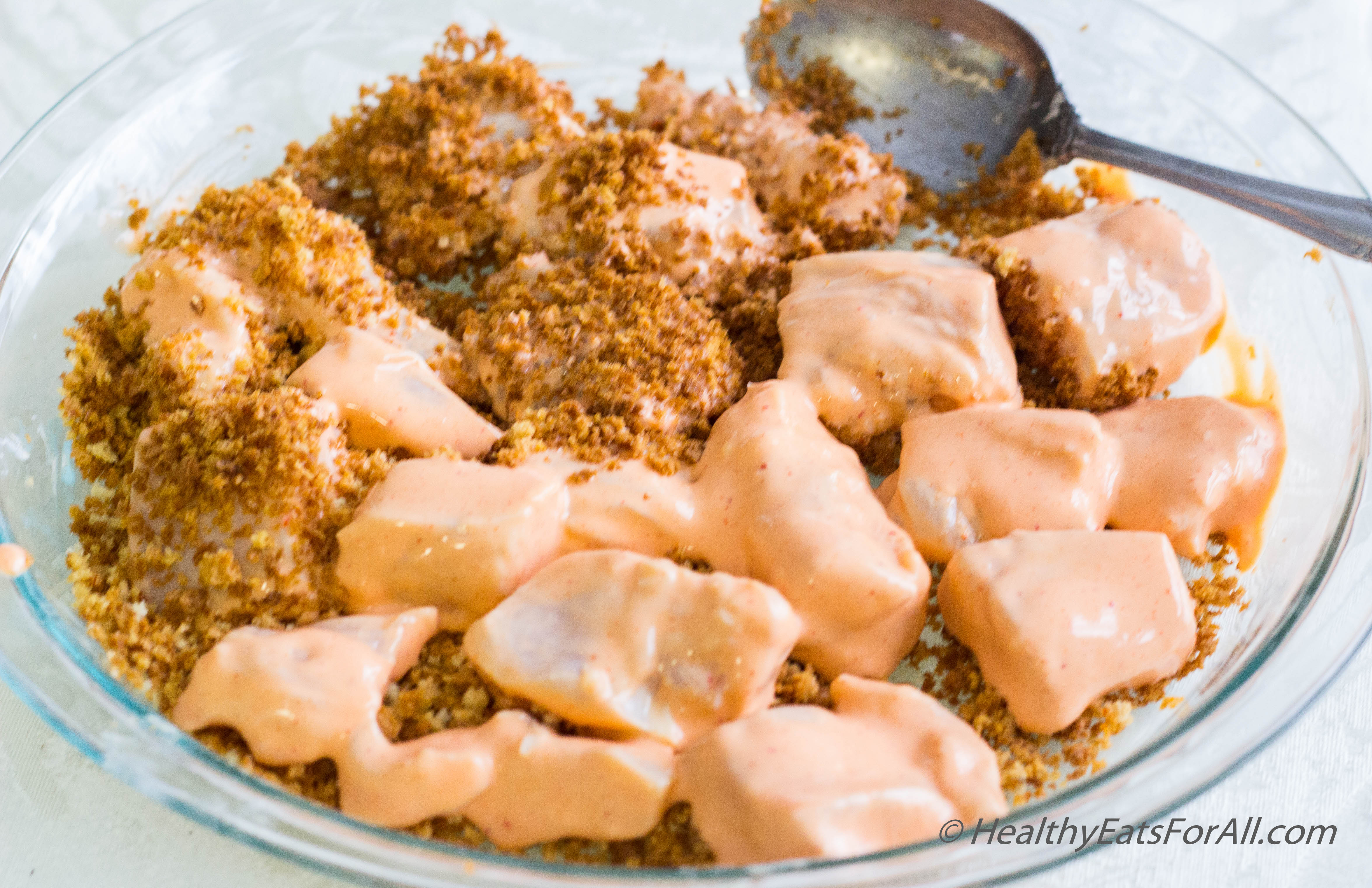 - Now take the marinated chicken and coat with panko crumbs by dipping a few pieces at a time.