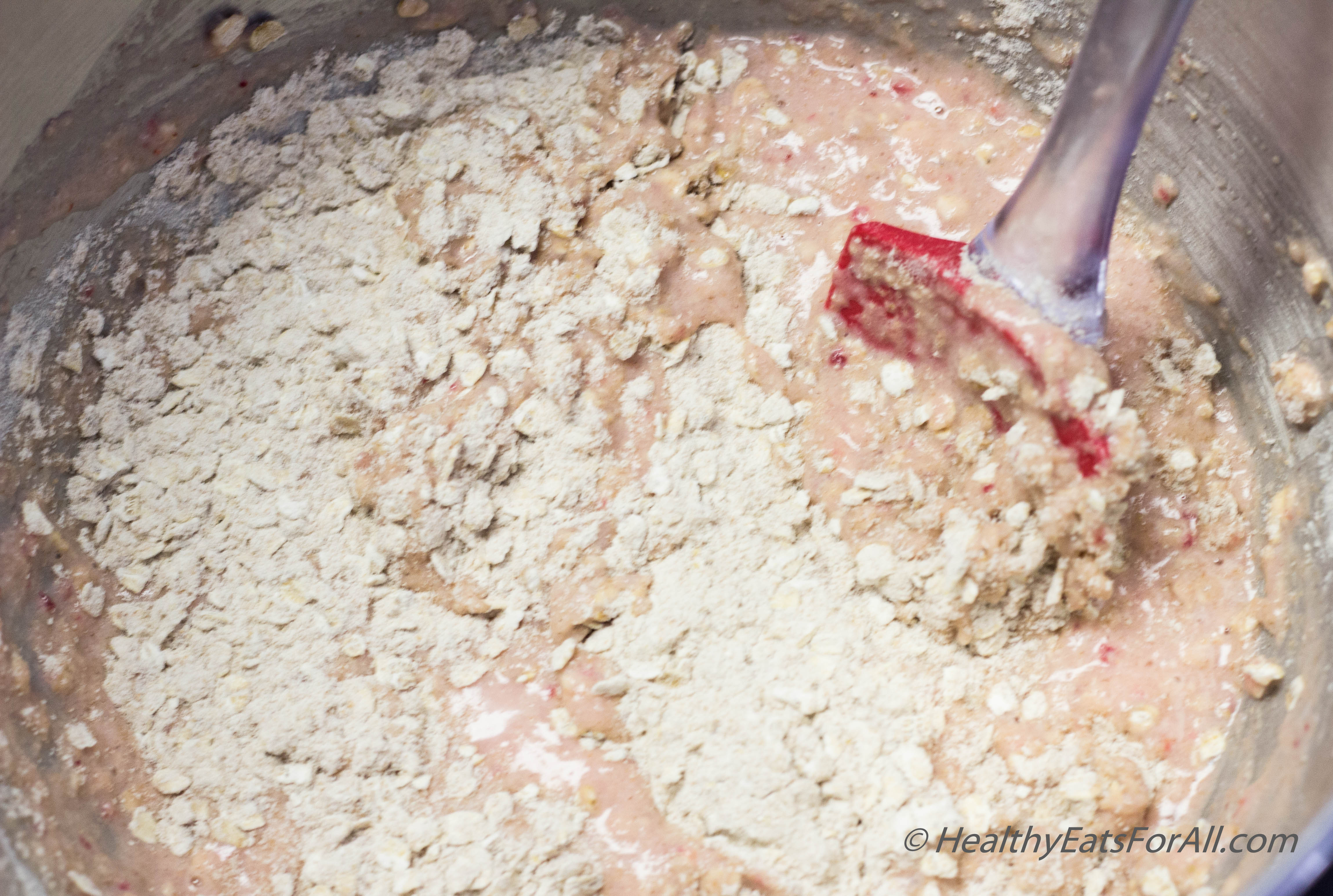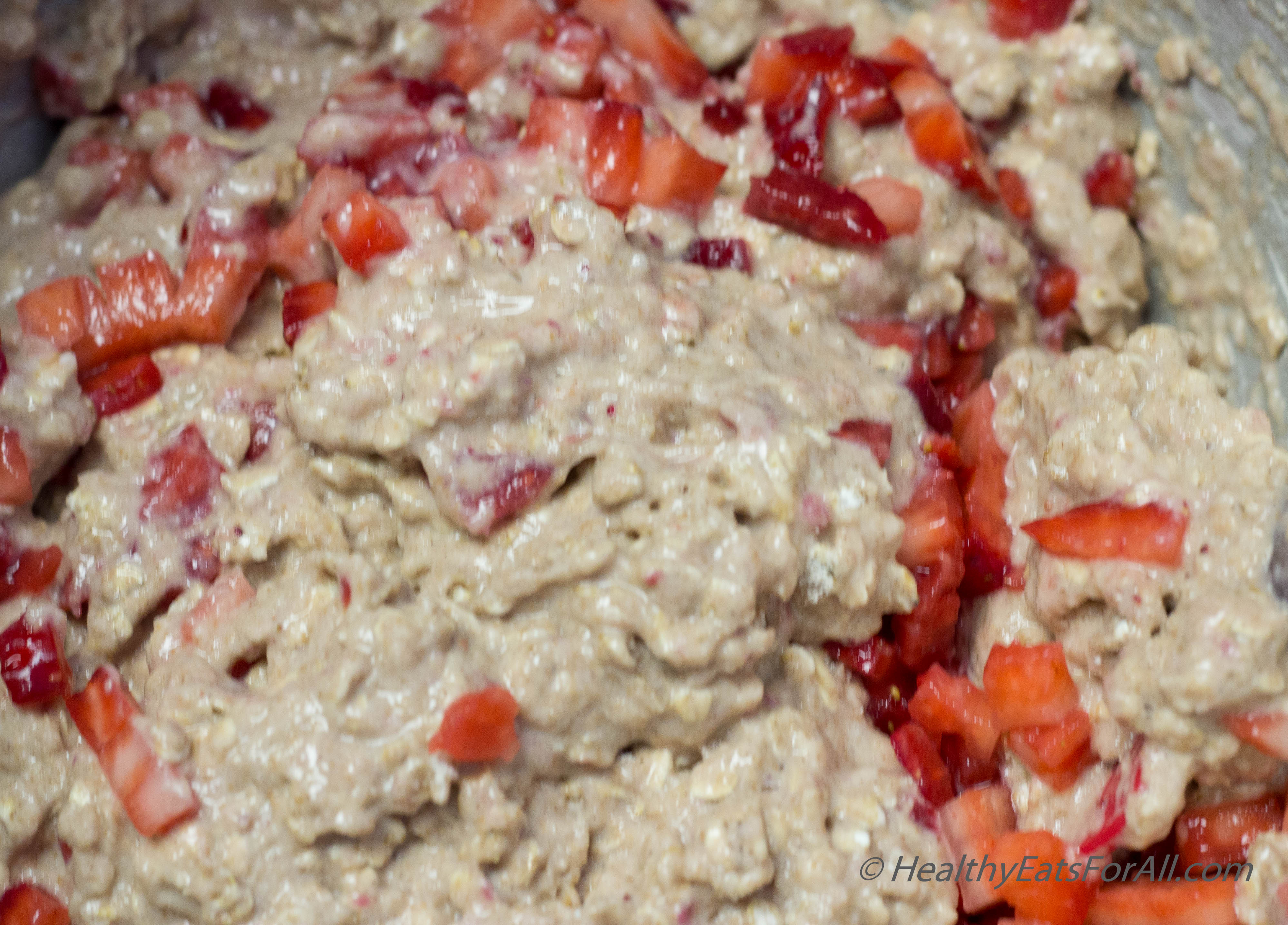 - In another larger bowl whisk the next wet ingredients except the diced strawberries.
