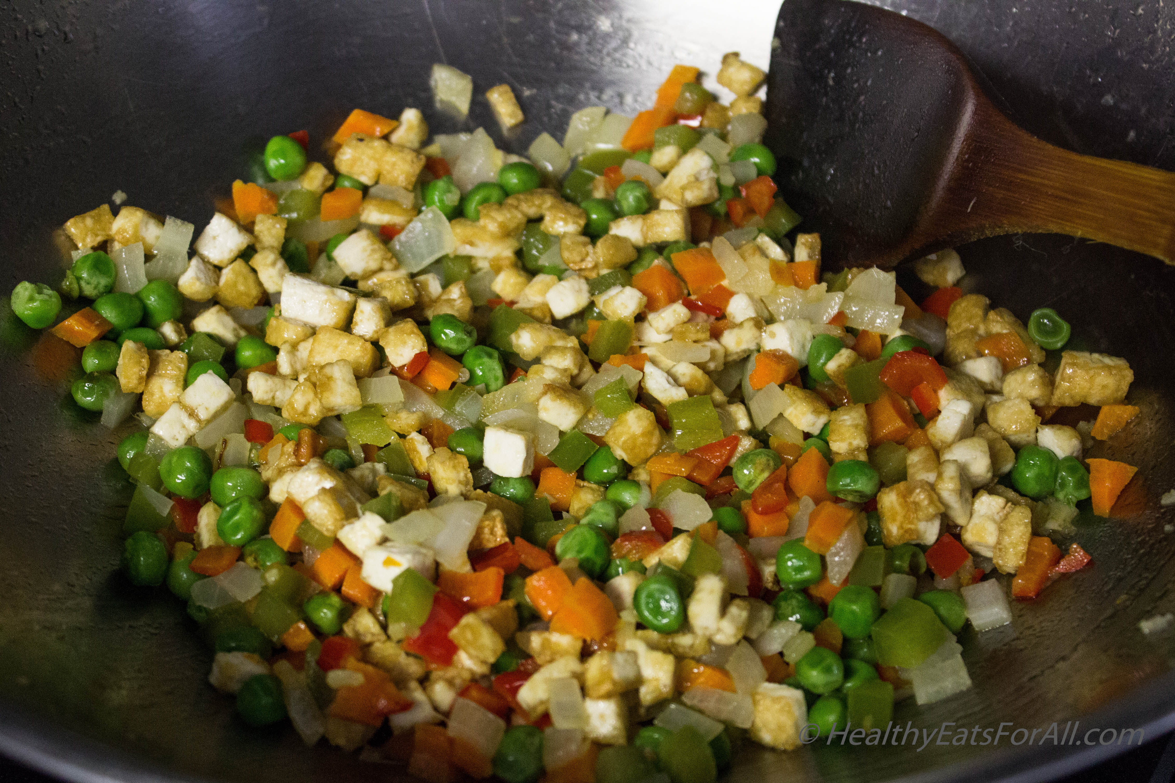 - Then add the onions, carrots, bell peppers, peas and tofu. Sauté for 2-3 minutes.