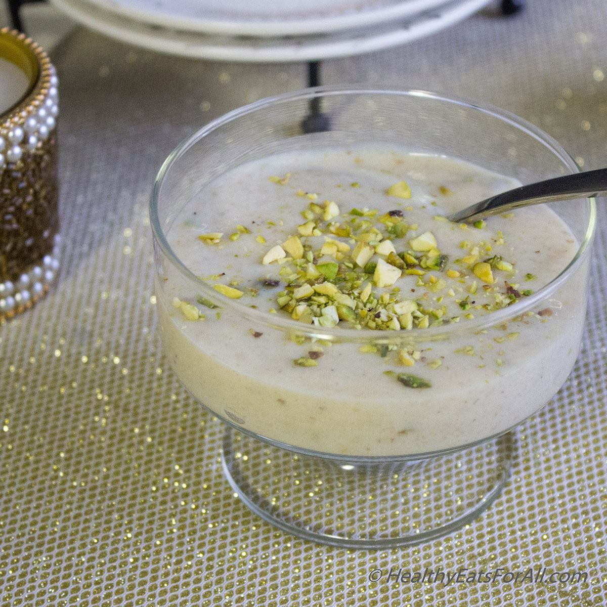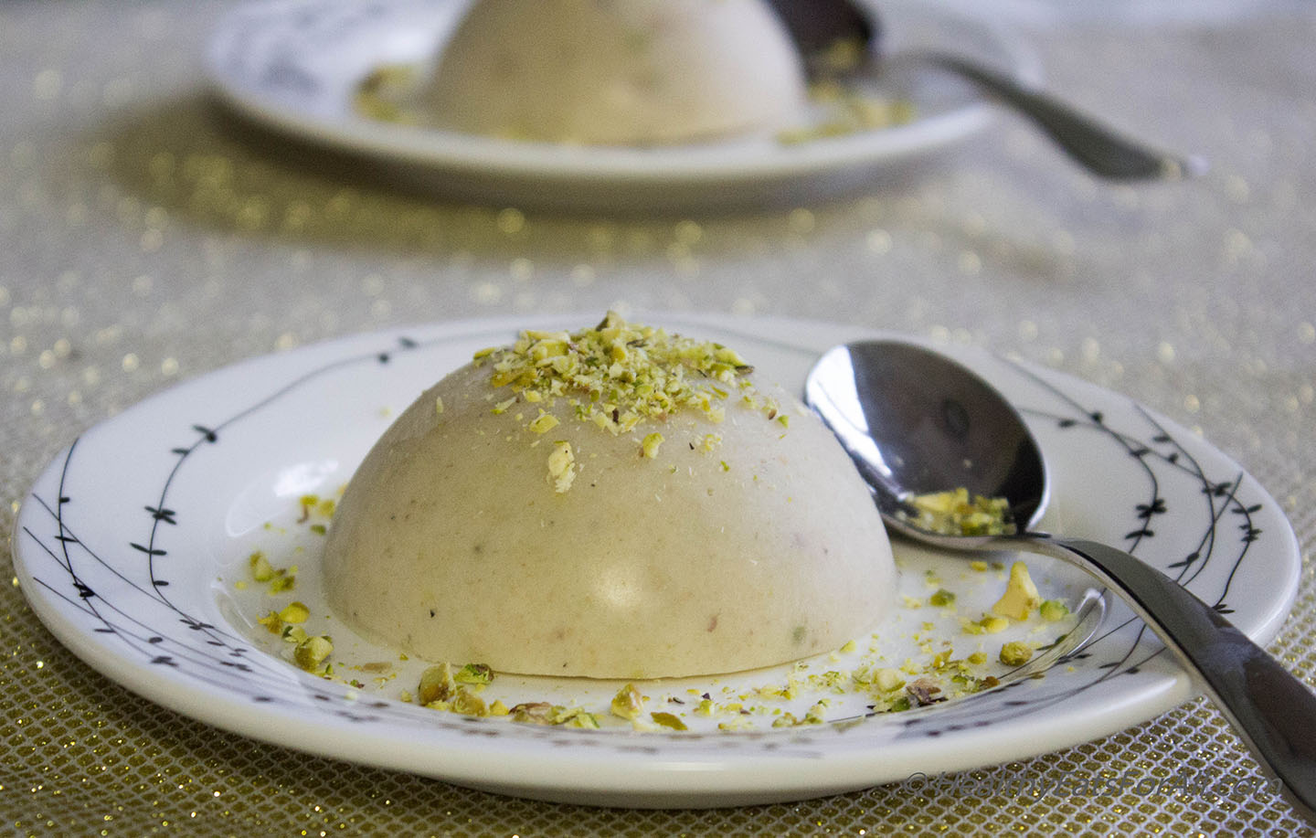 Kulfi is a frozen dessert from India which is popular as a street food. It is eaten like a Popsicle on a stick. But it has also been brought mainstream in a variety of shapes and flavors like pistachio, kesar (saffron) and mango etc. in restaurants. The typical kulfi is, as to be expected; is very high in fat, sugar and calories. It is served with or without Falooda (rice noodles with flavored sugar syrup). If you don’t like frozen treats then you can eat it as it is at room temperature also :). It will be then called Rabri (like pudding)and not Kulfi.