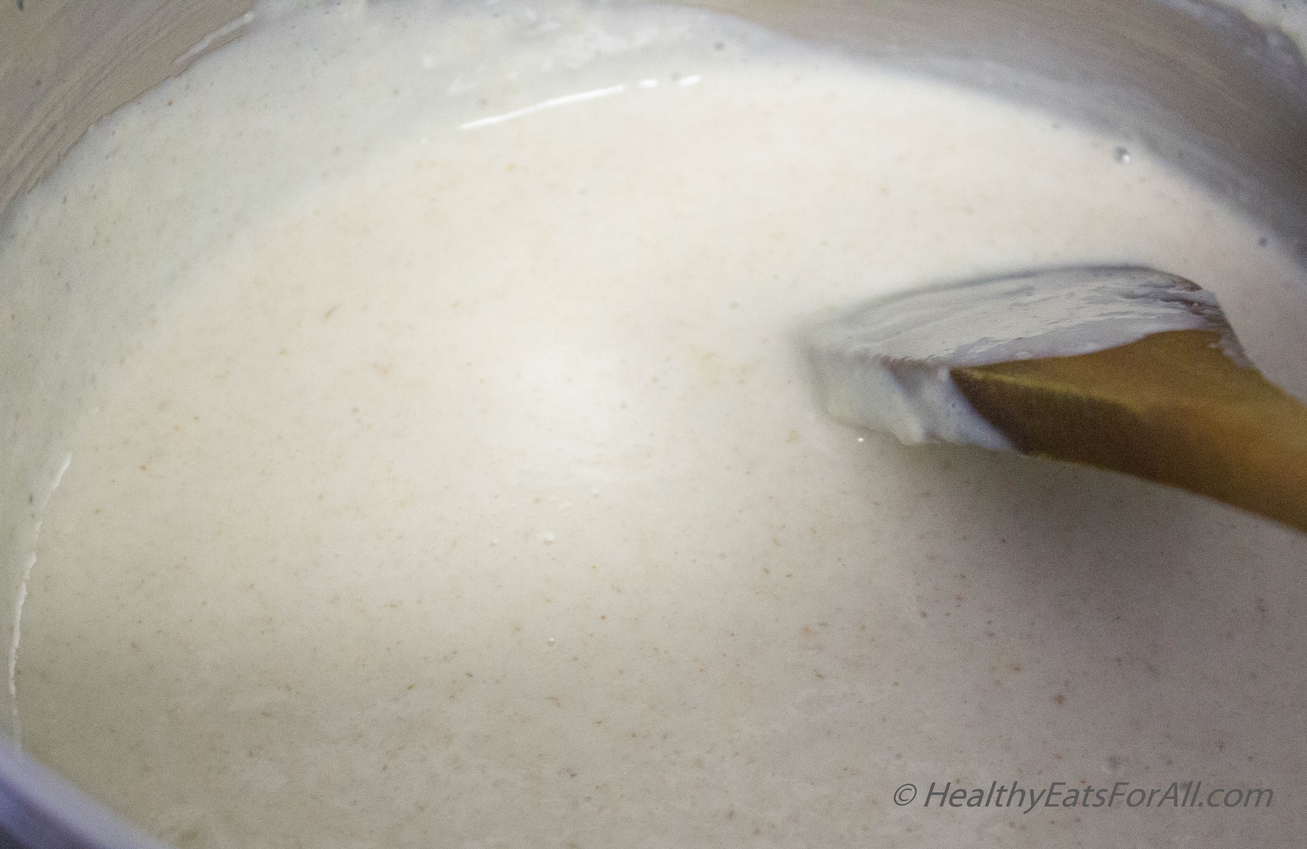 - Cool the mix for a bit then blend it in a NutriBullet or any blender so it is the consistency of a smooth pour-able pancake batter.