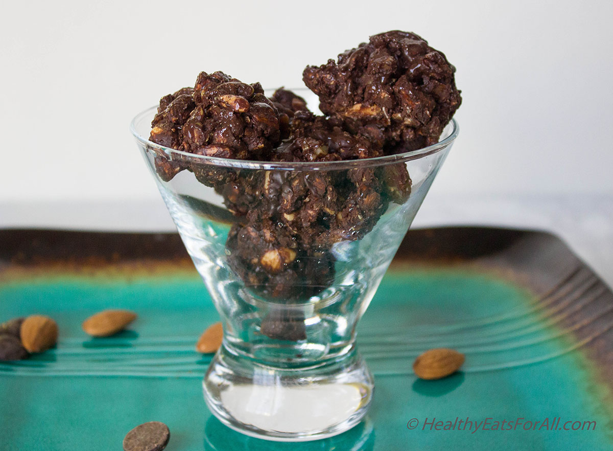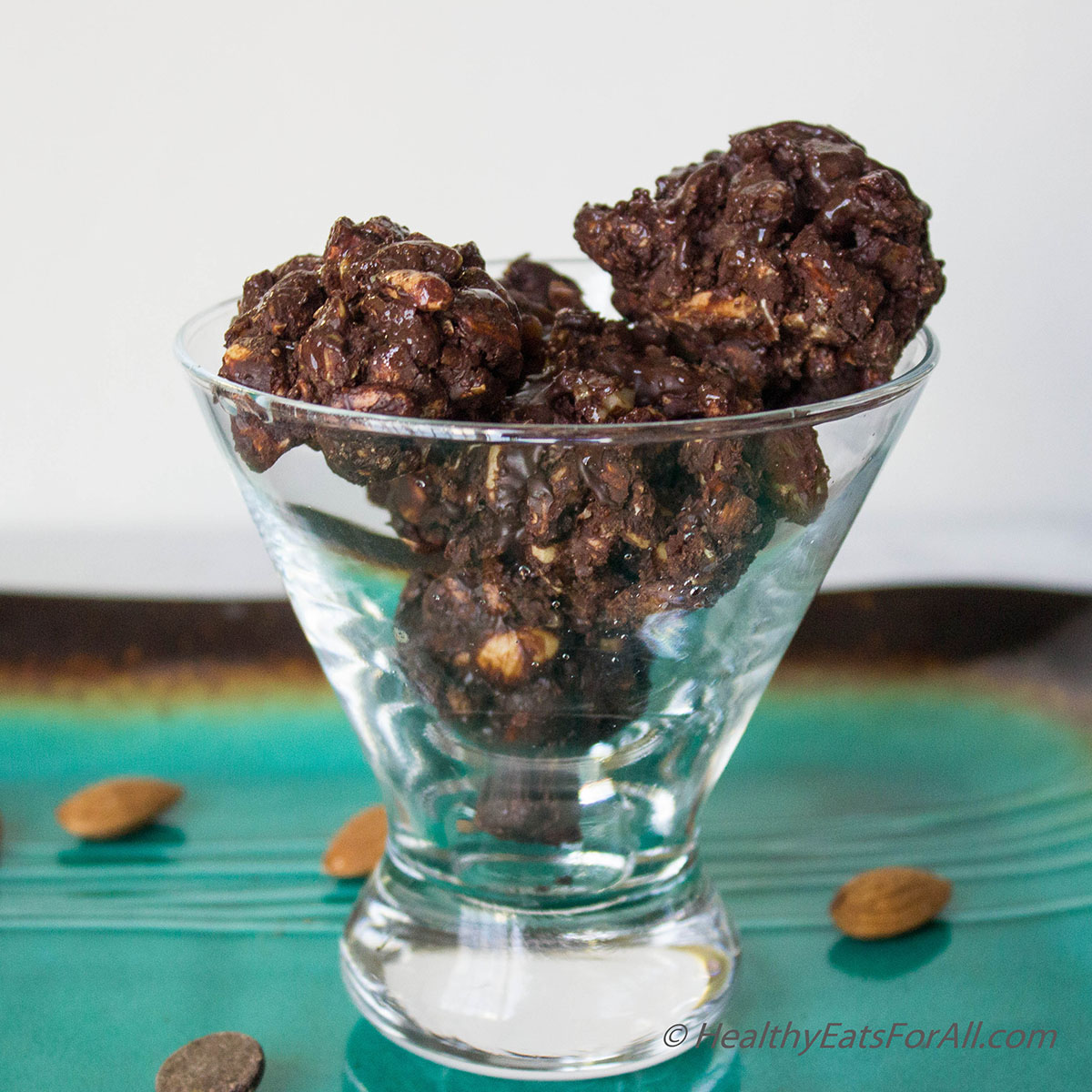 Chocolate Nut Clusters sound so sweet and decadent! Yet this recipe does not have any added sugar or fat at all! All it has are good for you nuts, seeds and some real good quality 60% cacao bittersweet chocolate. I have added rice krispies to give a crunch factor but it’s totally optional. These nut clusters are not only great for dessert but are also fantastic as mid day snacks and energy bites after working out!