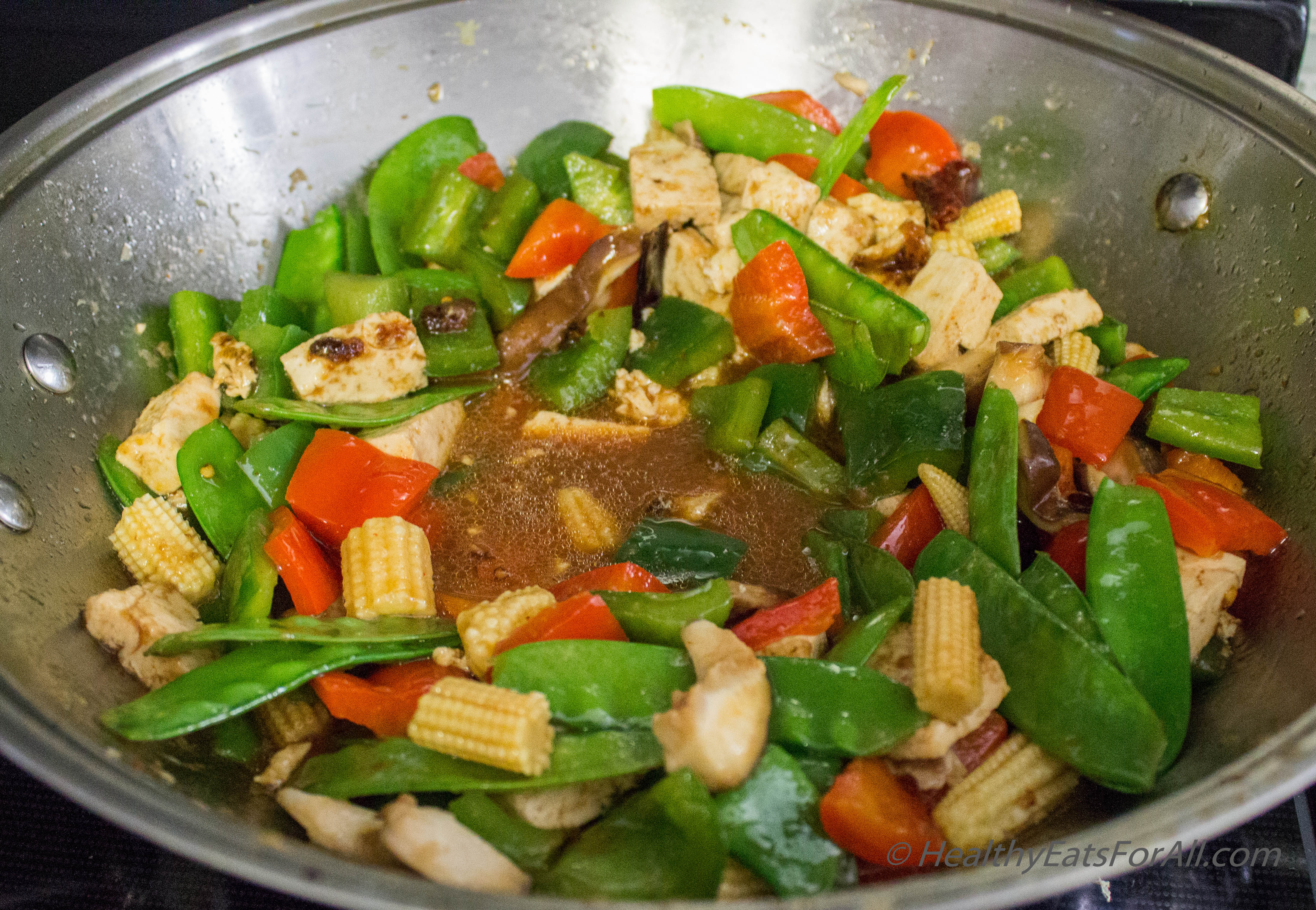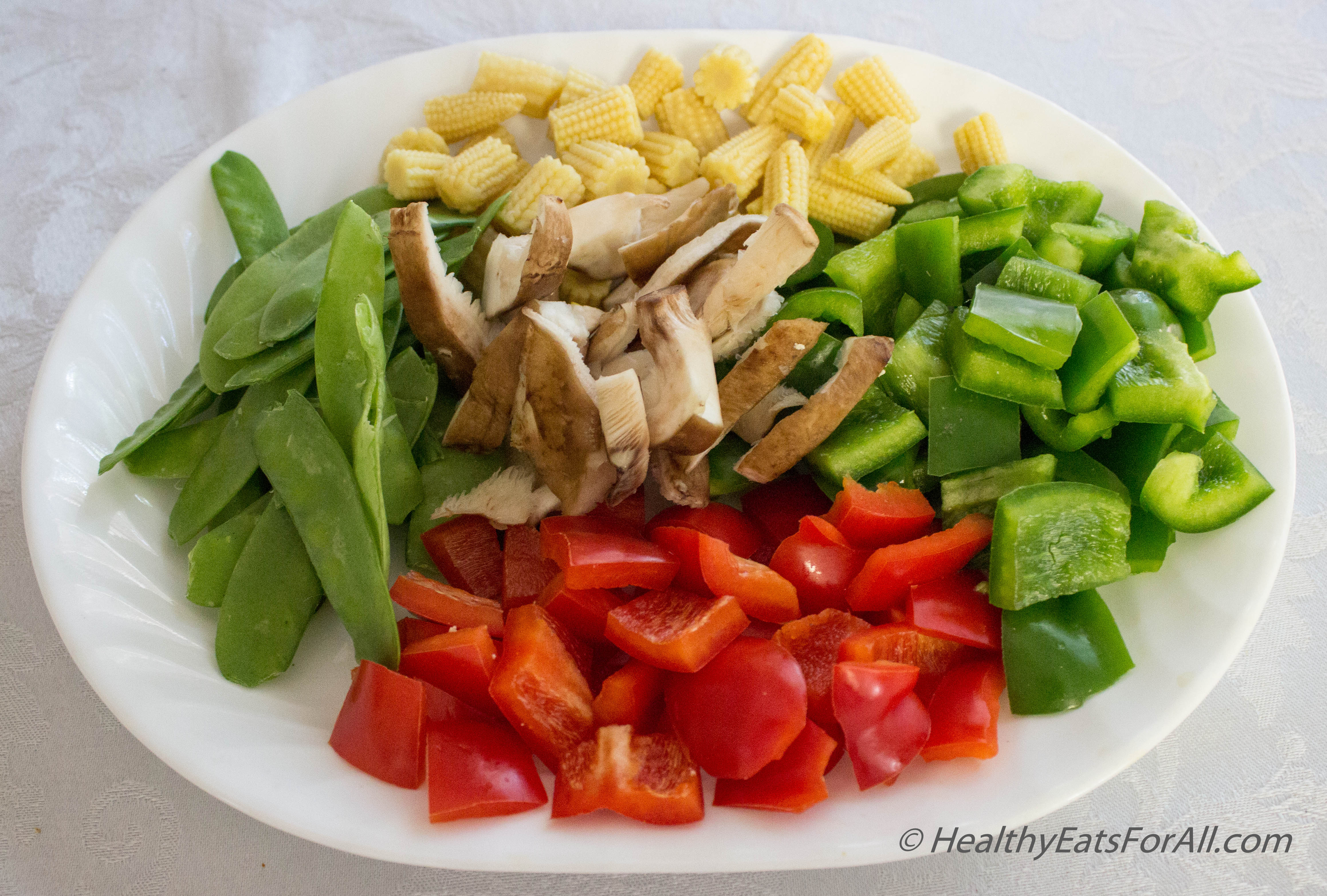 - Add red bell peppers, green bell peppers, snow peas, baby corn and cook for about 3 minutes. Veggies should remain crisp.