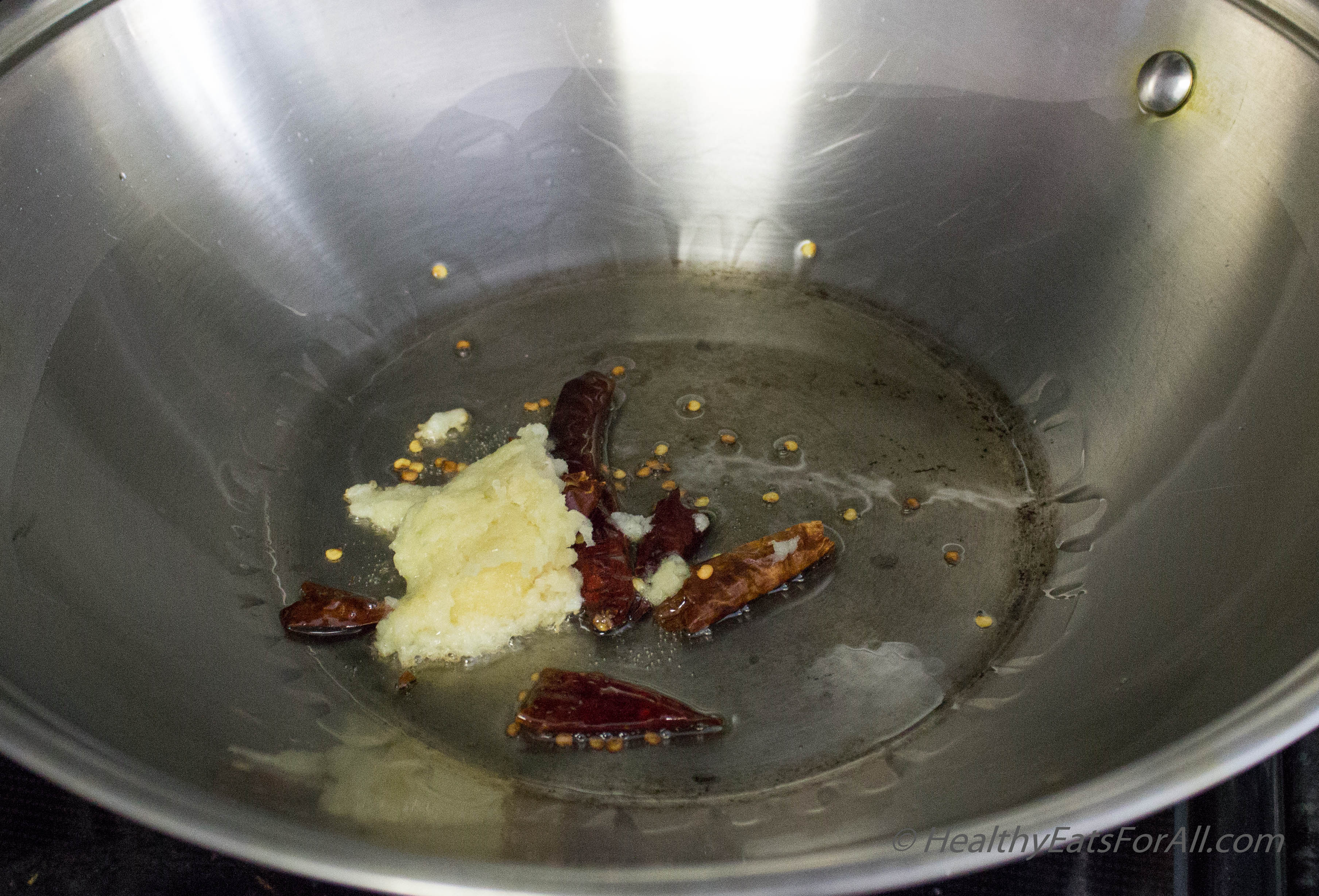 - Sauté ginger, garlic, and whole red chili pieces. Stir until fragrant.