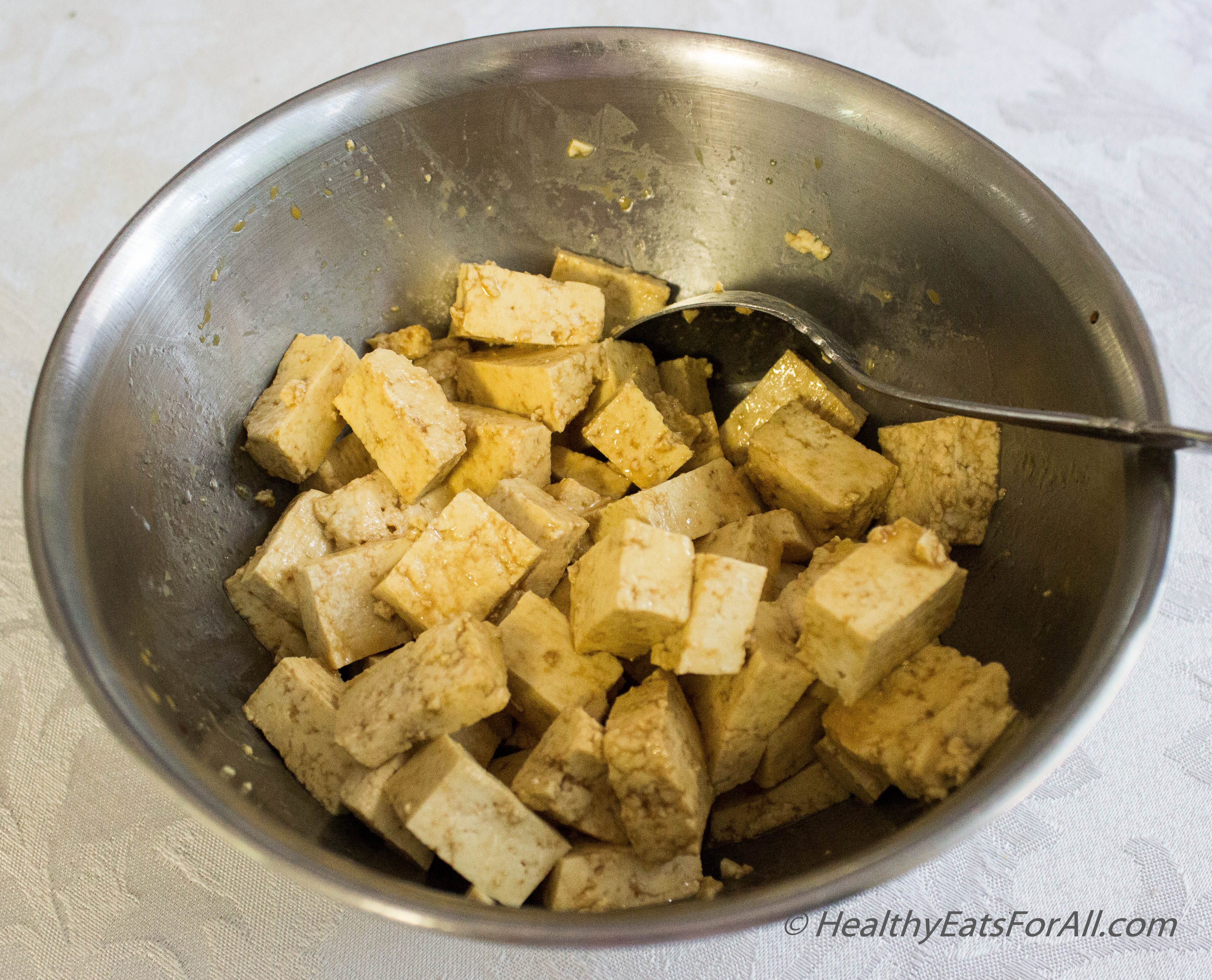 - First drain all the liquid from the Tofu and pat it dry. Then mix all the ingredients of the marinade and add the diced tofu/chicken. Place in refrigerator 30 minutes before cooking.