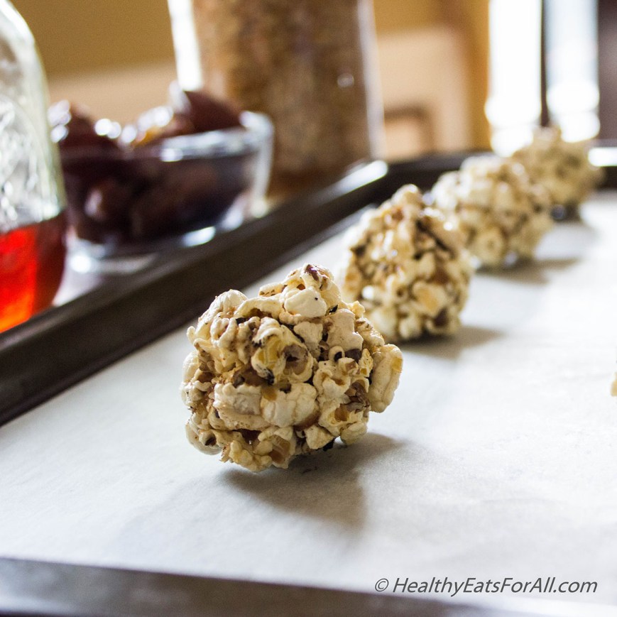 As soon as fall comes, there are some snacks that are synonymous with it. Popcorn balls are one those snacks. The ones readily available in the stores are either made with melted marshmallows or with corn syrup, with candy inside. Not exactly a picture of healthy foods! So here is my version of the popcorn balls using dates and honey. The version I have here today in front of you doesn’t have any nuts. But please feel free to chop up some almonds or cashews and add to the mix. They are a fantastic healthy vegan snack to pack in a lunch box for a midday snack or an evening snack or even super fabulous dessert!
