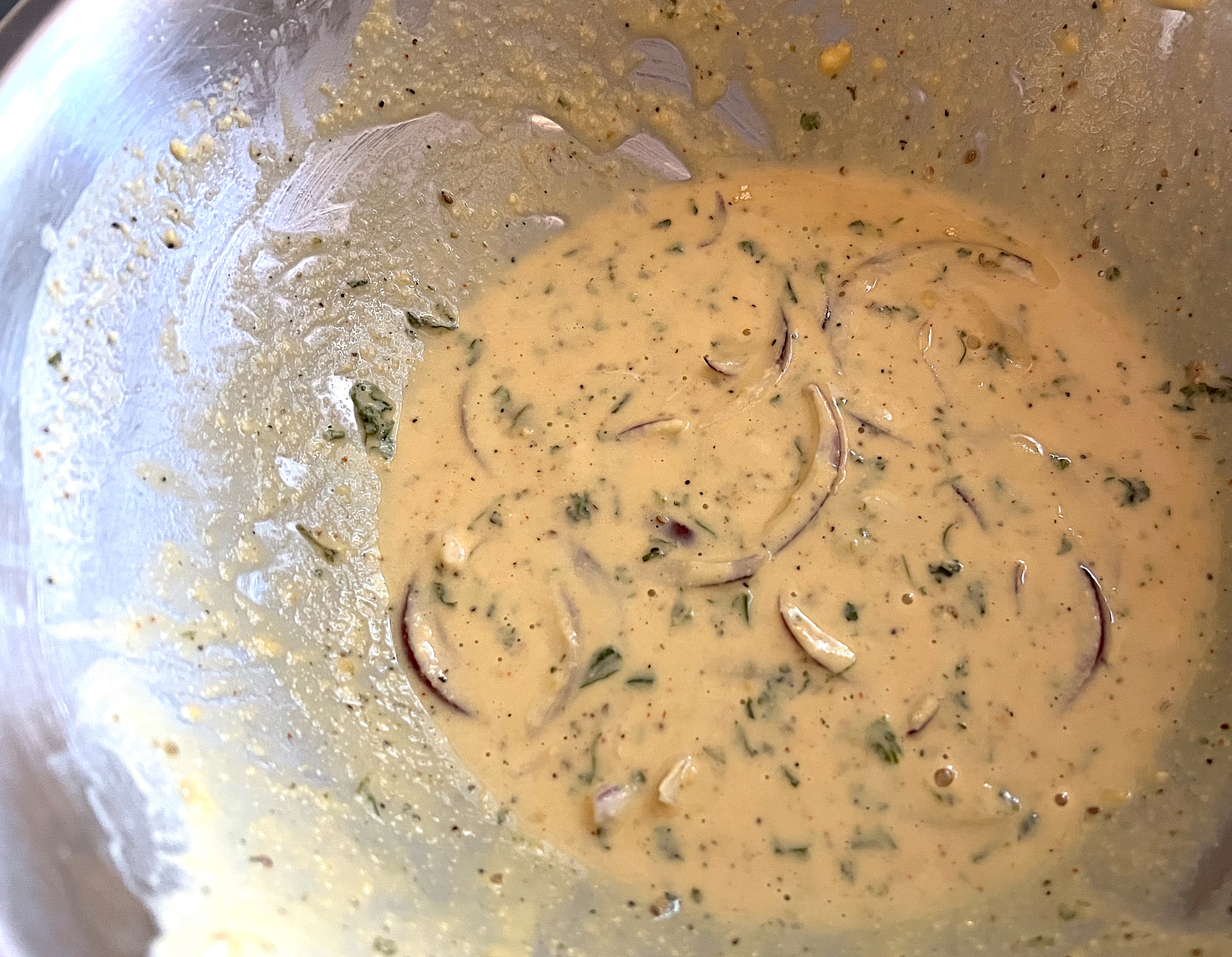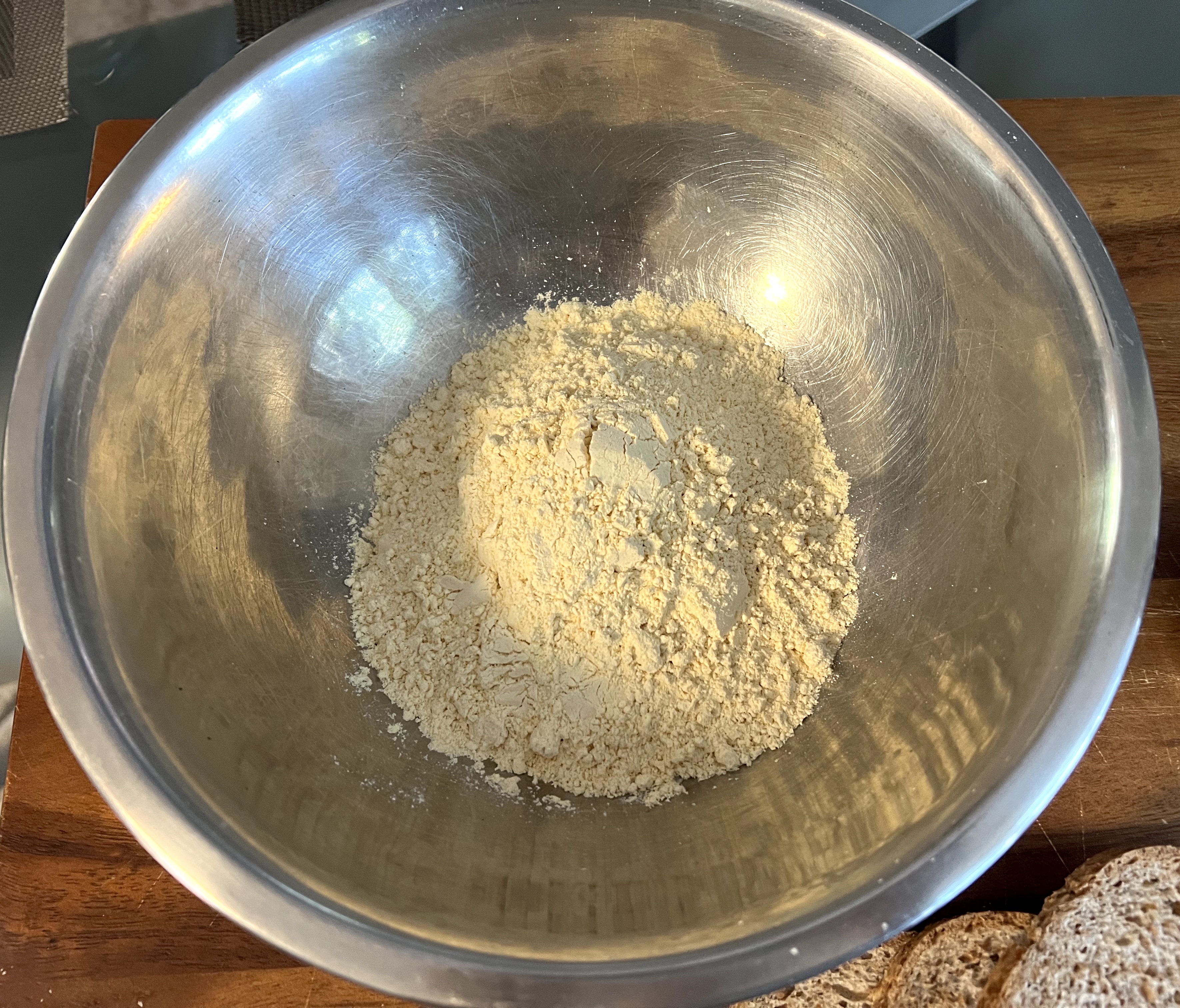 - Add the dry seasonings and seeds to the chickpea flour and mix well with the flour.