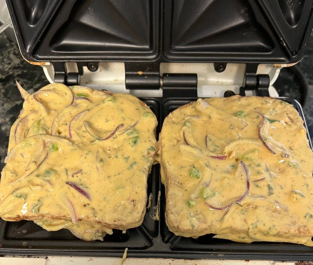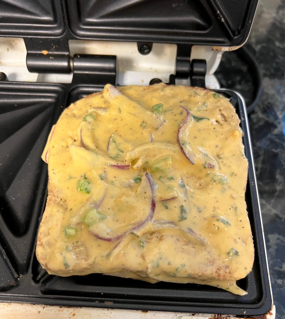 - Dip one slice of the bread in the batter and make sure both sides are well covered with the batter including onions etc. Then place it on the sandwich/waffle maker.