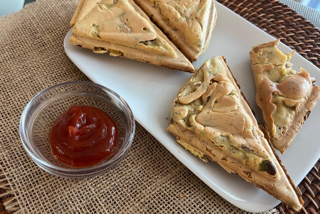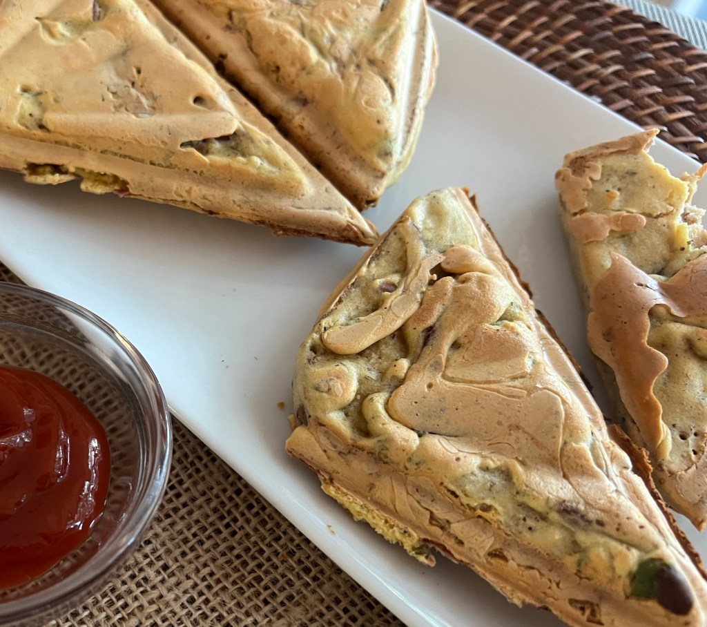 So if you can make this without even a drop of oil or the deep frying, its brilliant! Totally guilt free comfort food. All you need is a Sandwich Maker or a Waffle Maker. The bread I prefer is the Exekiel Bread. It’s got the best of both worlds: it’s tasty and nutritious. It is loaded with micronutrients and macronutrients that’ll keep you satiated and stay healthy. Its ingredient list contains 100 percent wholesome ingredients. It is made from Organic Sprouted grains and lentils and no added sugar. Since all these are sprouted, more nutrients are available to us. Sprouting of the grains and legumes makes this bread easier to digest and much more nutrient dense. To top it, it has no additives or preservatives!